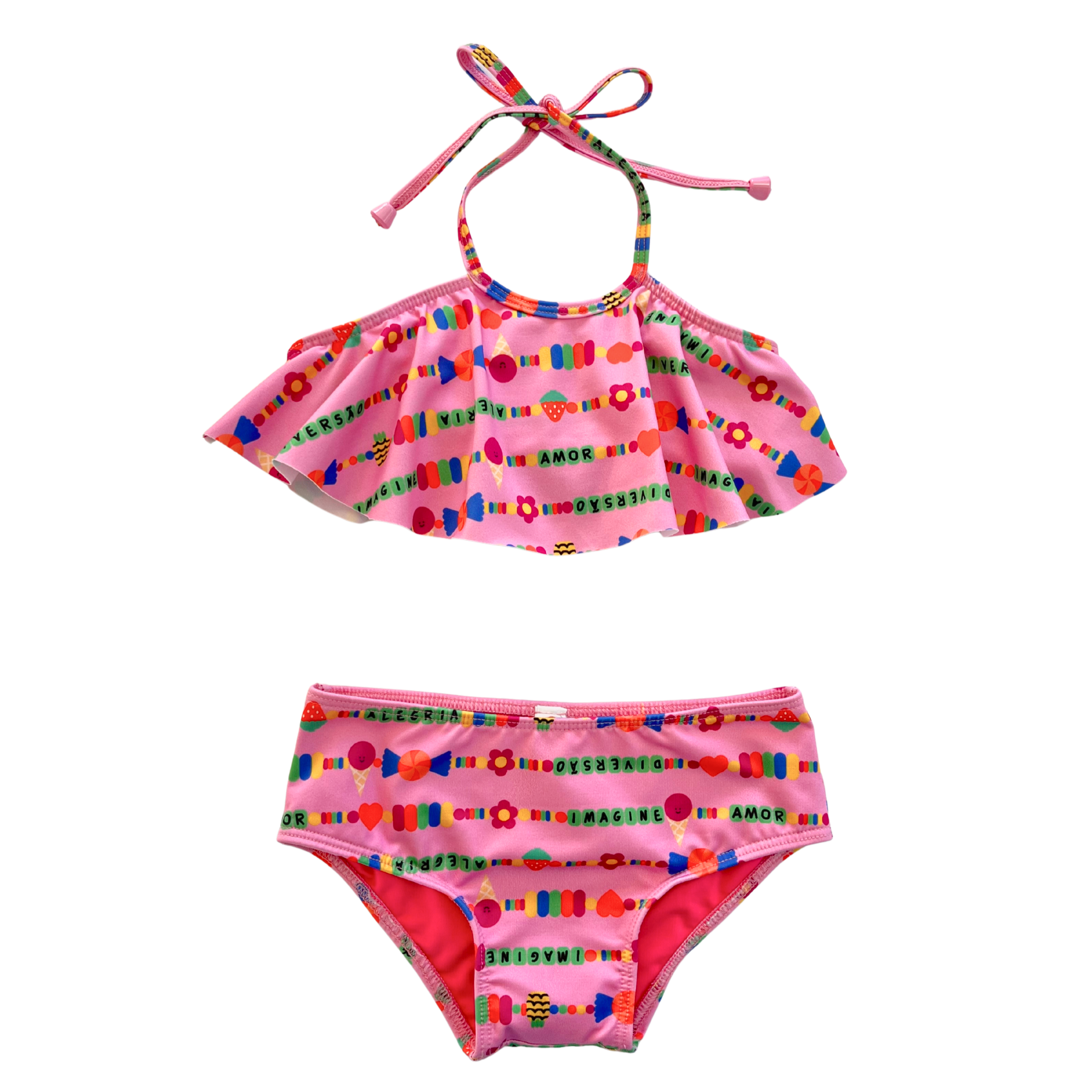 Biquini infantil desenvolvido em malha com proteção UV. Top modelo frente única e calcinha com modelagem confortável. Feito com a nossa estampa exclusiva “PULSEIRINHAS DIVERTIDAS”.