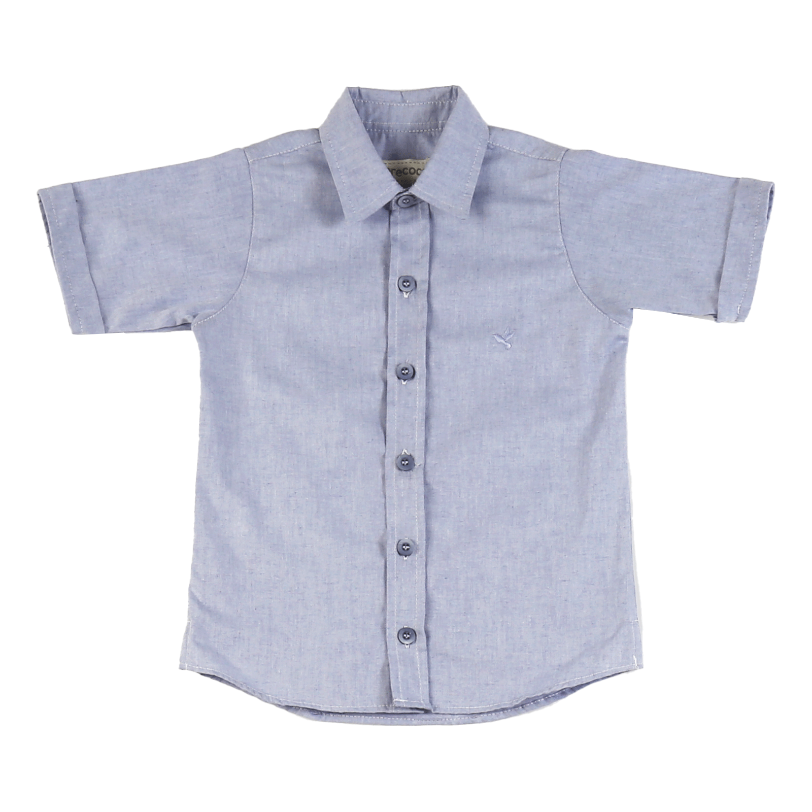 Camisa infantil masculina em tecido de algodão, gola e modelagem tradicional, manga curta, e botões na frente.