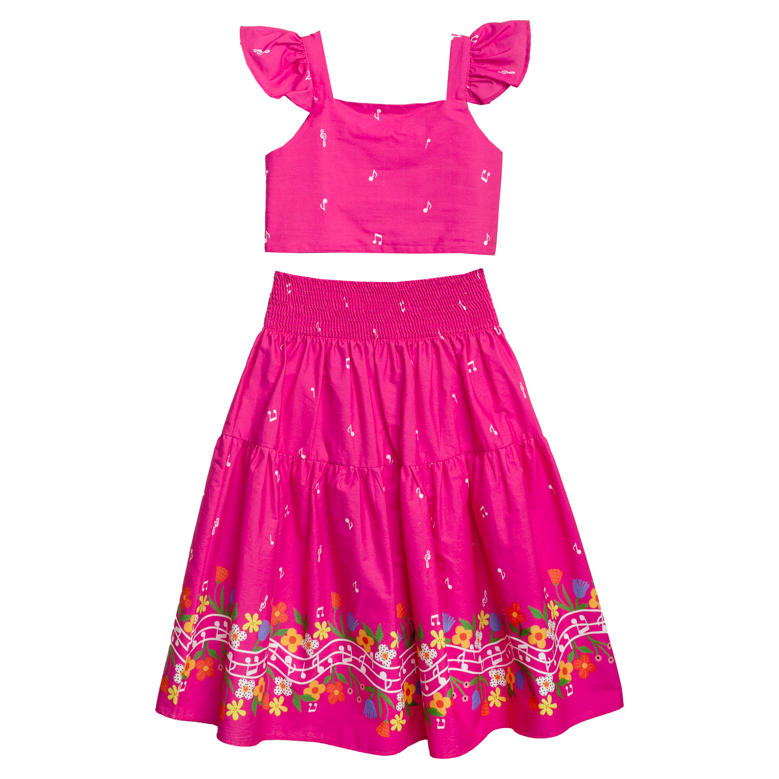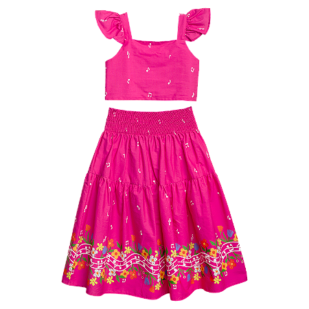Conjunto infantil feminino em tecido de algodão, cropped com decote reto, alças com babadinhos e lastex nas costas, acompanha faixa para amarração. Saia com cós de lastex e babado. Feito com a nossa estampa exclusiva “SINFONIA DE FLORES”.