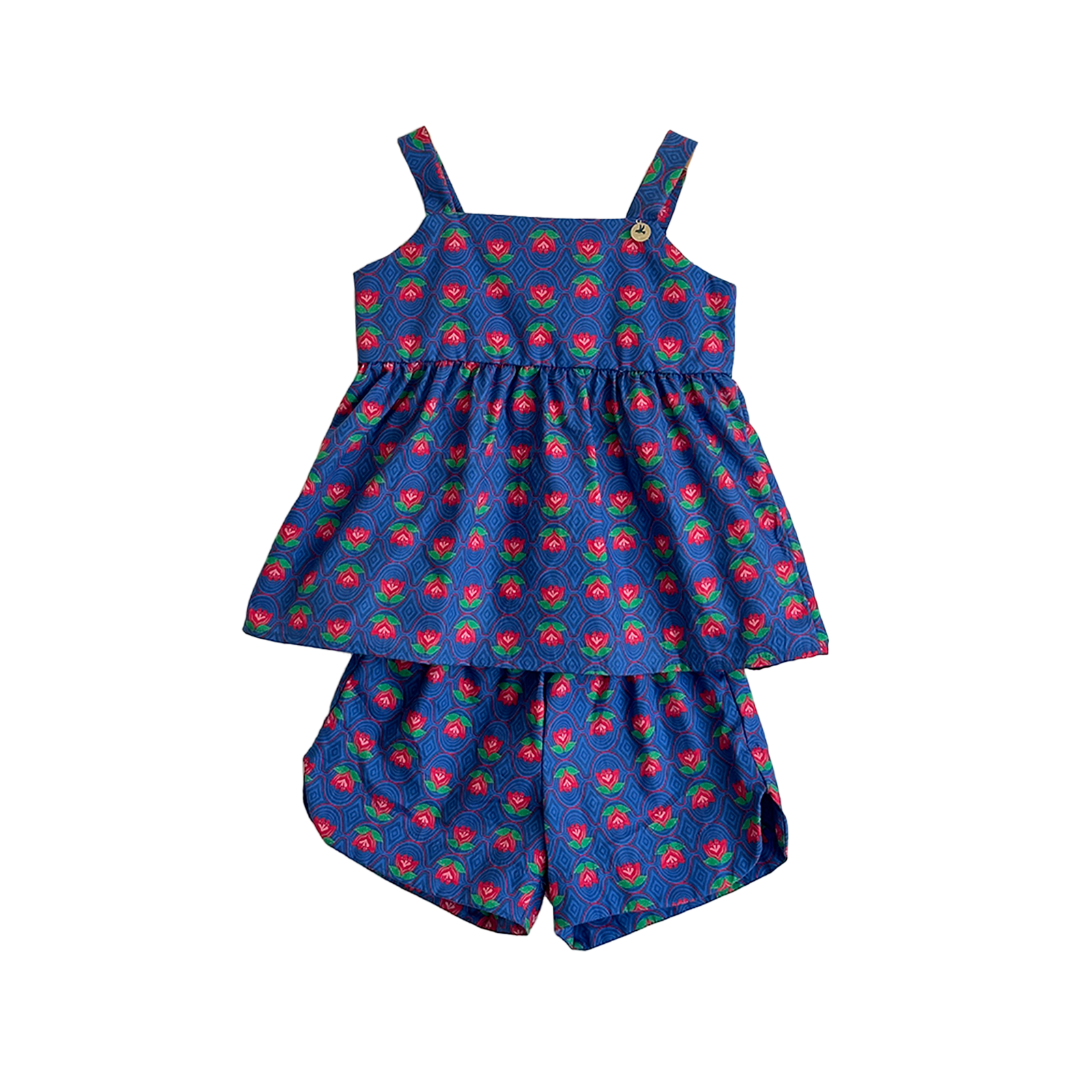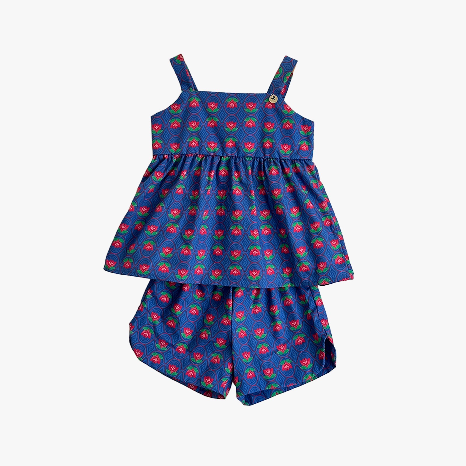 Conjunto infantil em tecido de algodão, blusa decote reto, alças largas, pala média franzindo e abrindo a roda da blusa, abotoamento nas costas, shortinho com cós de elástico, barra larga arredondada. Feito com nossa estampa exclusiva “FLOR DE LOTUS". Essa peça foi desenvolvida especialmente para o Precoce por Menos.