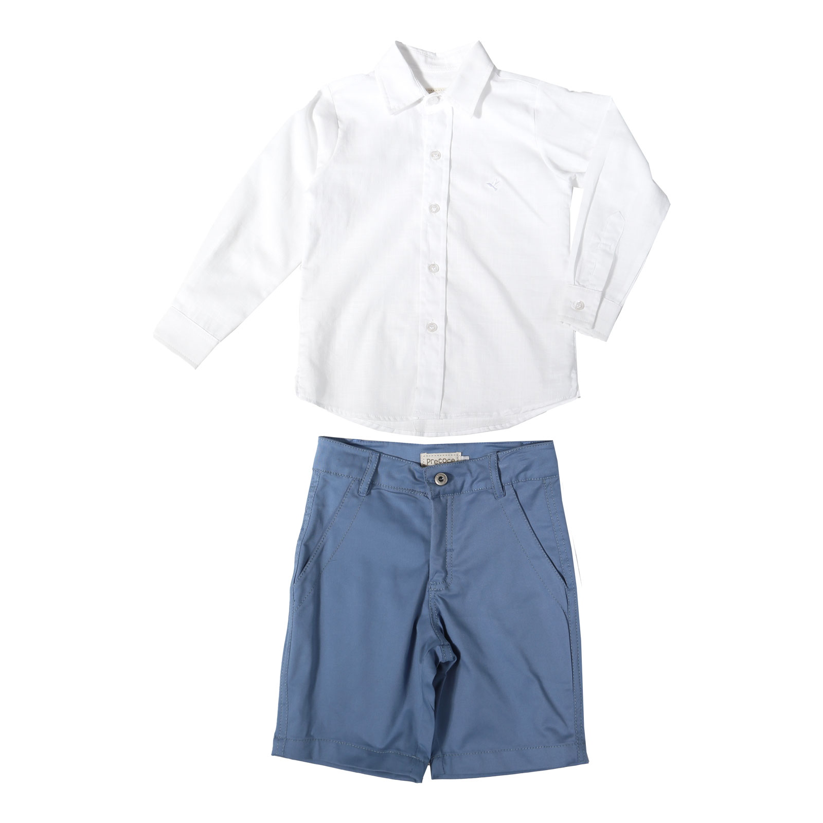 Conjunto infantil masculino, camisa social, em tecido de algodão, com gola e modelagem tradicional, manga longa e punho com abotoamento, e botões na frente.