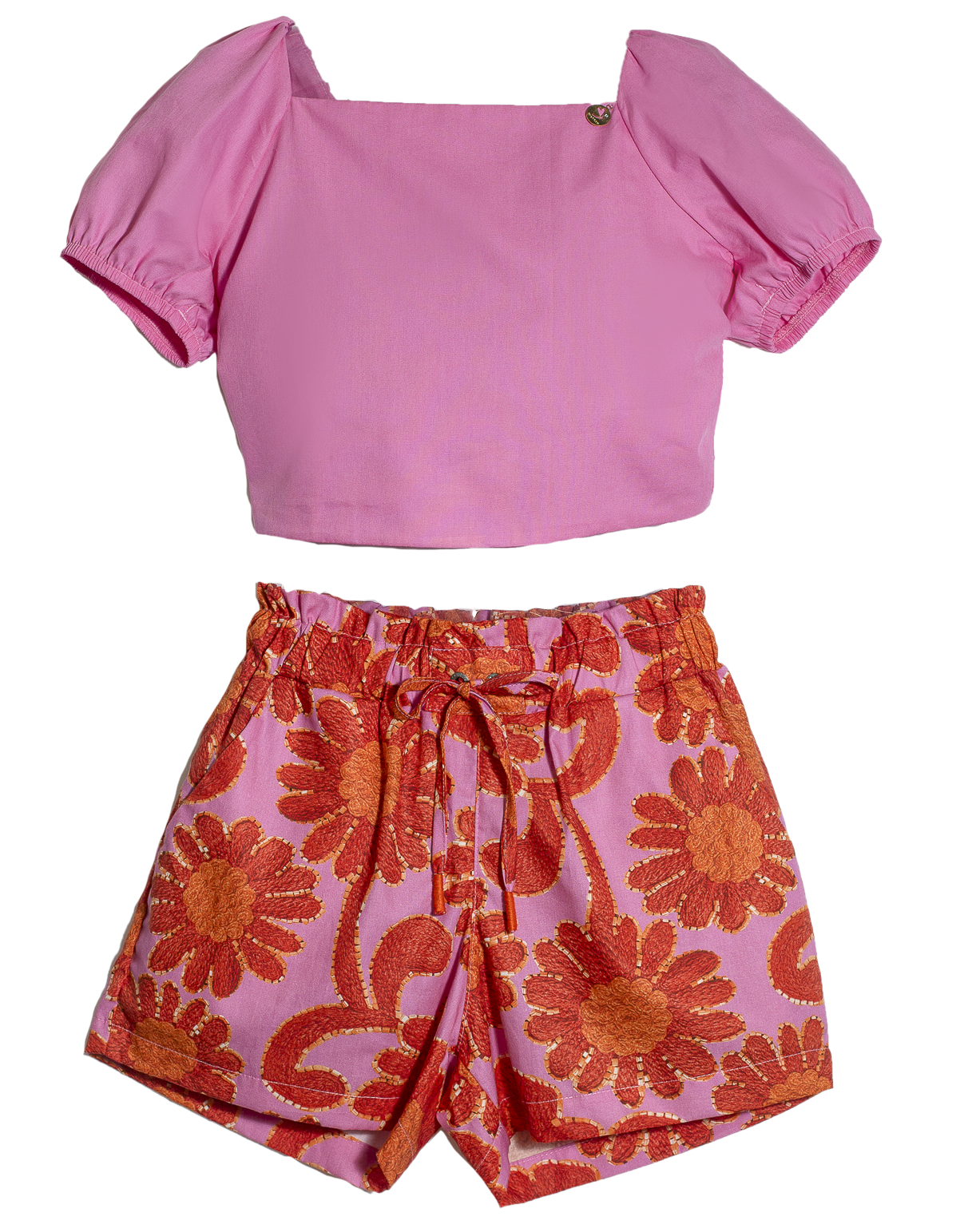 Conjunto infantil feminino em tecido de algodão, blusa decote reto, mangas fofas, decote e amarração nas costas.