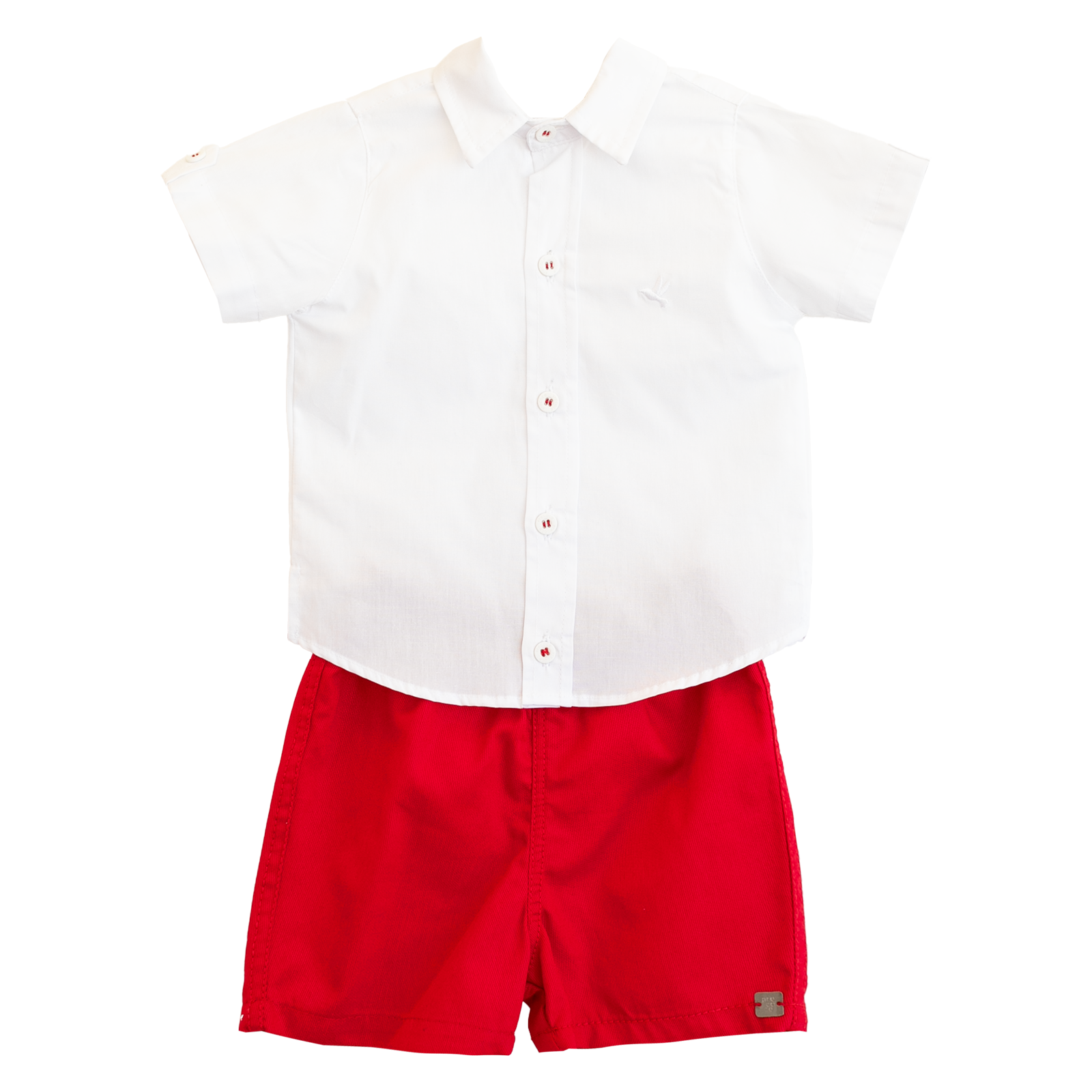 Conjunto bebê masculino, camisa manga curta em tecido de algodão, gola tradicional, abotoamento frontal, bordado pássaro Precoce, detalhe com botão nas mangas. Bermuda em tecido de algodão e elástico na cintura, modelagem confortável.