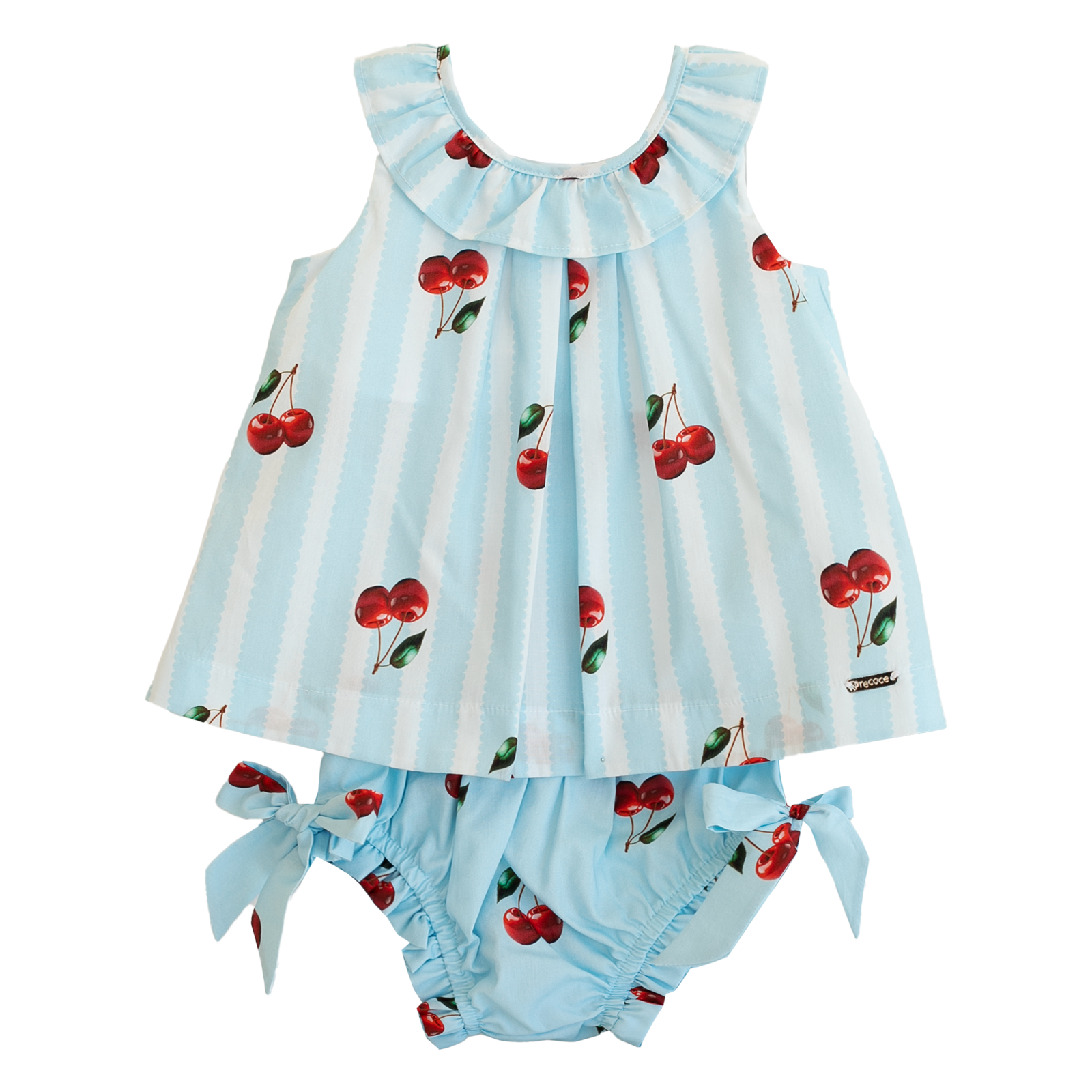 Vestido infantil em tecido de algodão, decote em U com babadinho, modelagem evasê, abotoamento nas costas. Calcinha com elástico na cintura e entre pernas e lacinhos nas laterais. Feito com a nossa estampa exclusiva “CEREJINHA AZUL CLARO LISTRADA”.