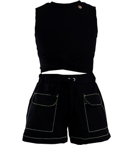 Conjunto feminino, cropped malha preta, sem manga, amarração barra e short preto, presponto verde, bolso frente, elástico na cintura e cadarço.