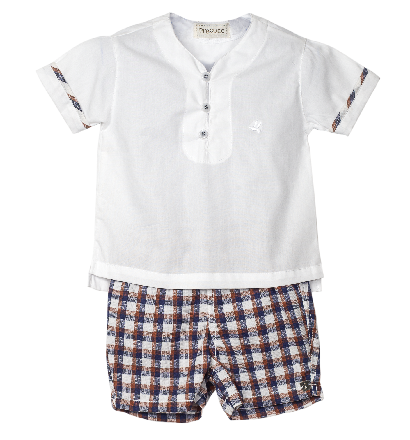 Conjunto bebê masculino em tecido de algodão, túnica manga curta, abertura com abotoamento frontal, bordado pássaro Precoce.