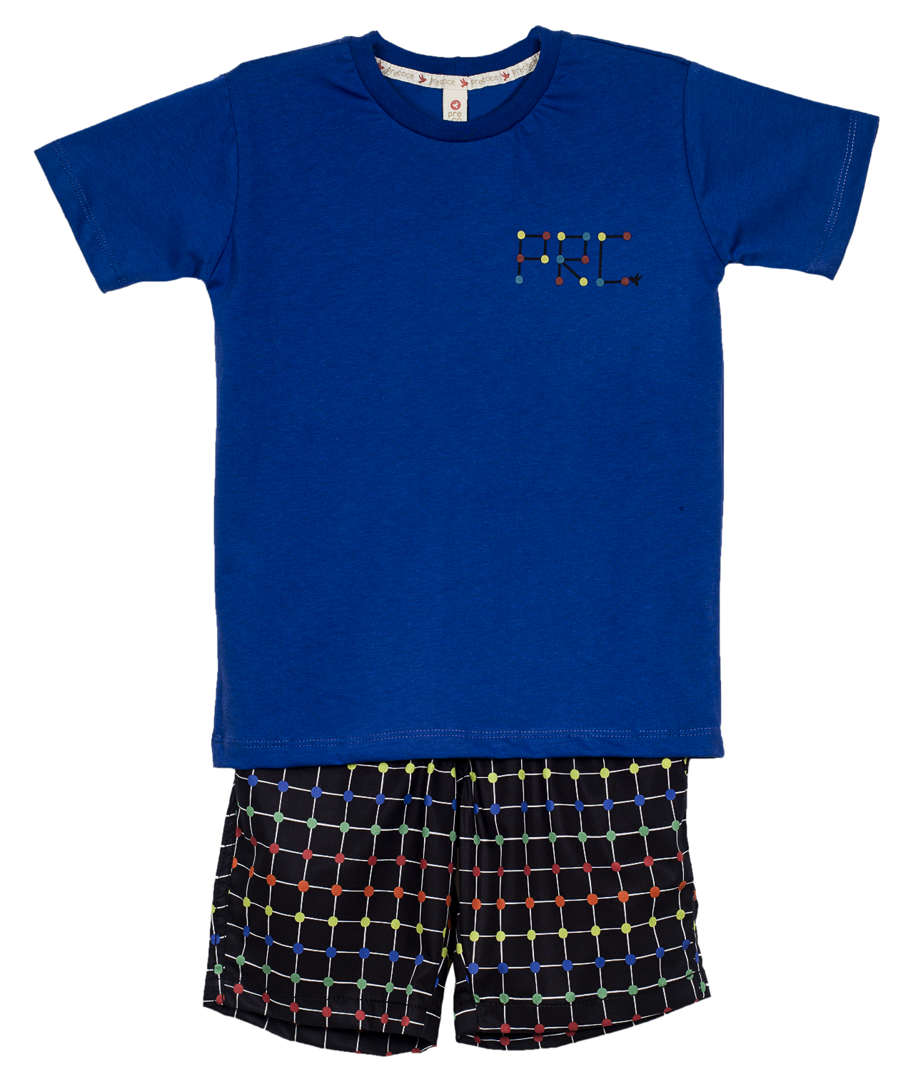 Conjunto infantil masculino, T-shirt em malha de algodão, decote careca, manga curta, estampa localizada. Bermuda em tecido de algodão, elástico na cintura, modelagem confortável, bolso faca, feita com nossa estampa exclusiva “ALFINETES MAGICOS”.
