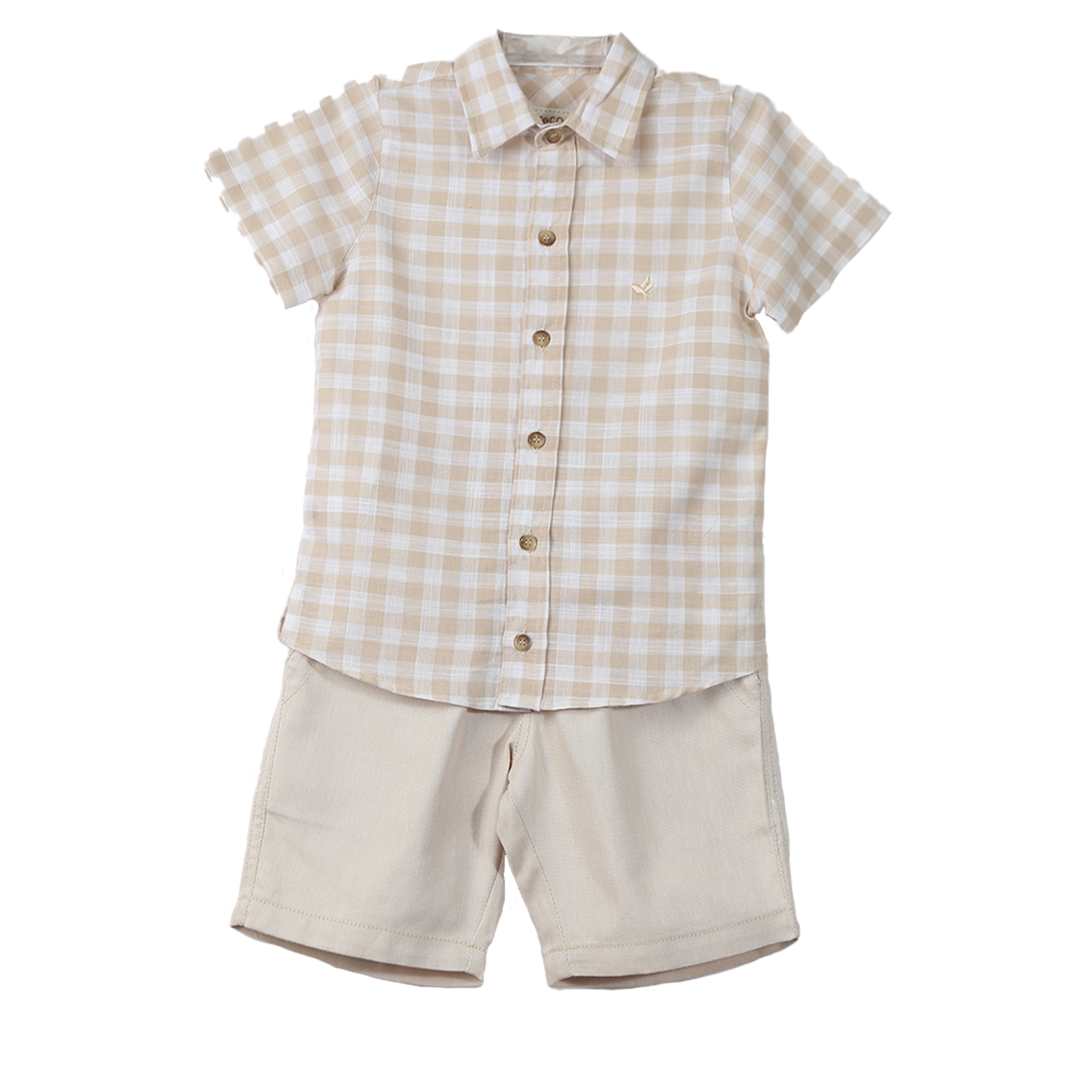 Conjunto infantil masculino, camisa em tecido de algodão, gola e modelagem tradicional, manga curta, e botões na frente. Bermuda em tecido de algodão, bolso faca, cós com elástico, modelagem confortável.