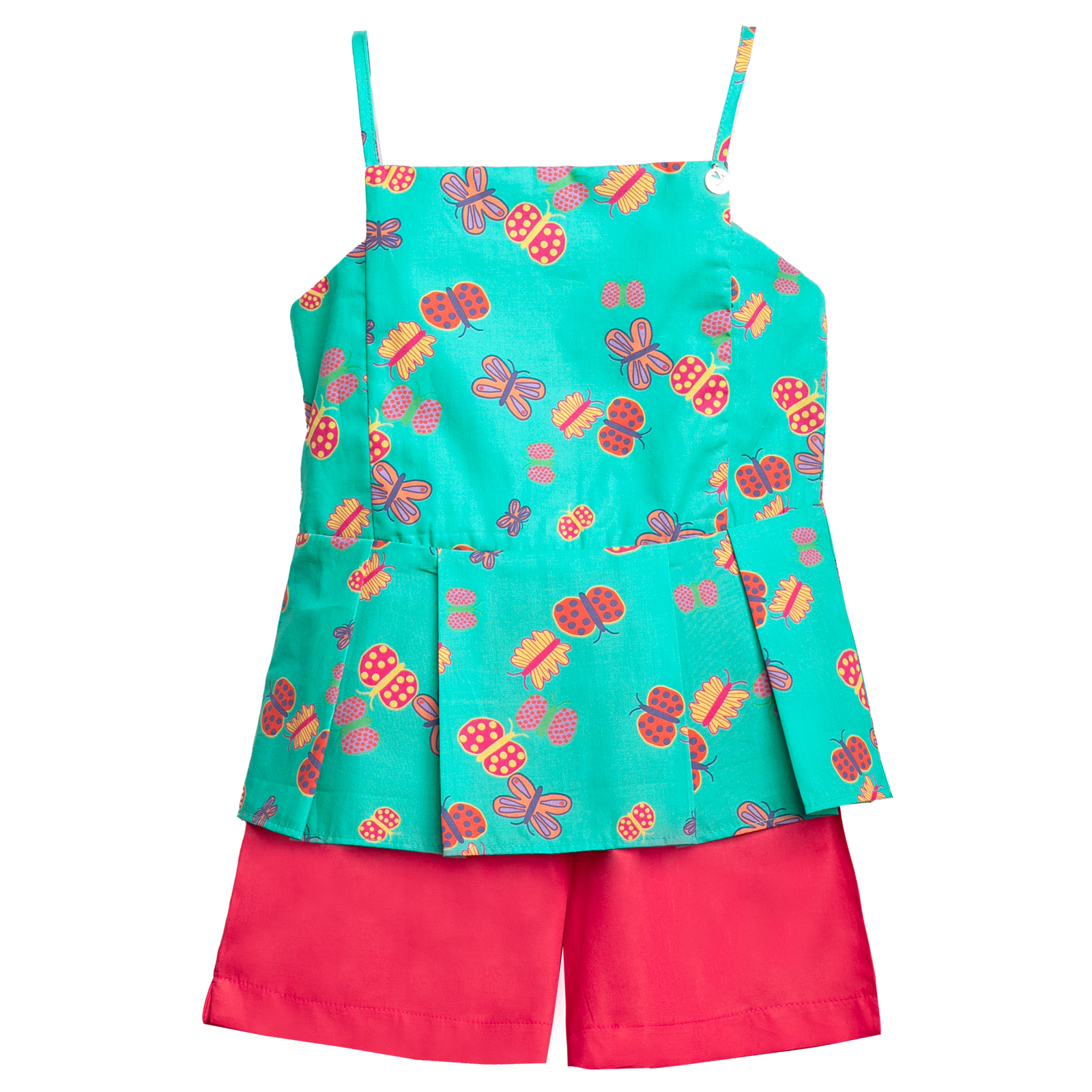 Conjunto infantil em tecido de algodão. Blusa com alcinha regulável, modelagem com recortes, e babadinho na barra. Shortinho com cós de elástico soltinho e confortável. Feito com a nossa estampa exclusiva “BORBOLETAS”.