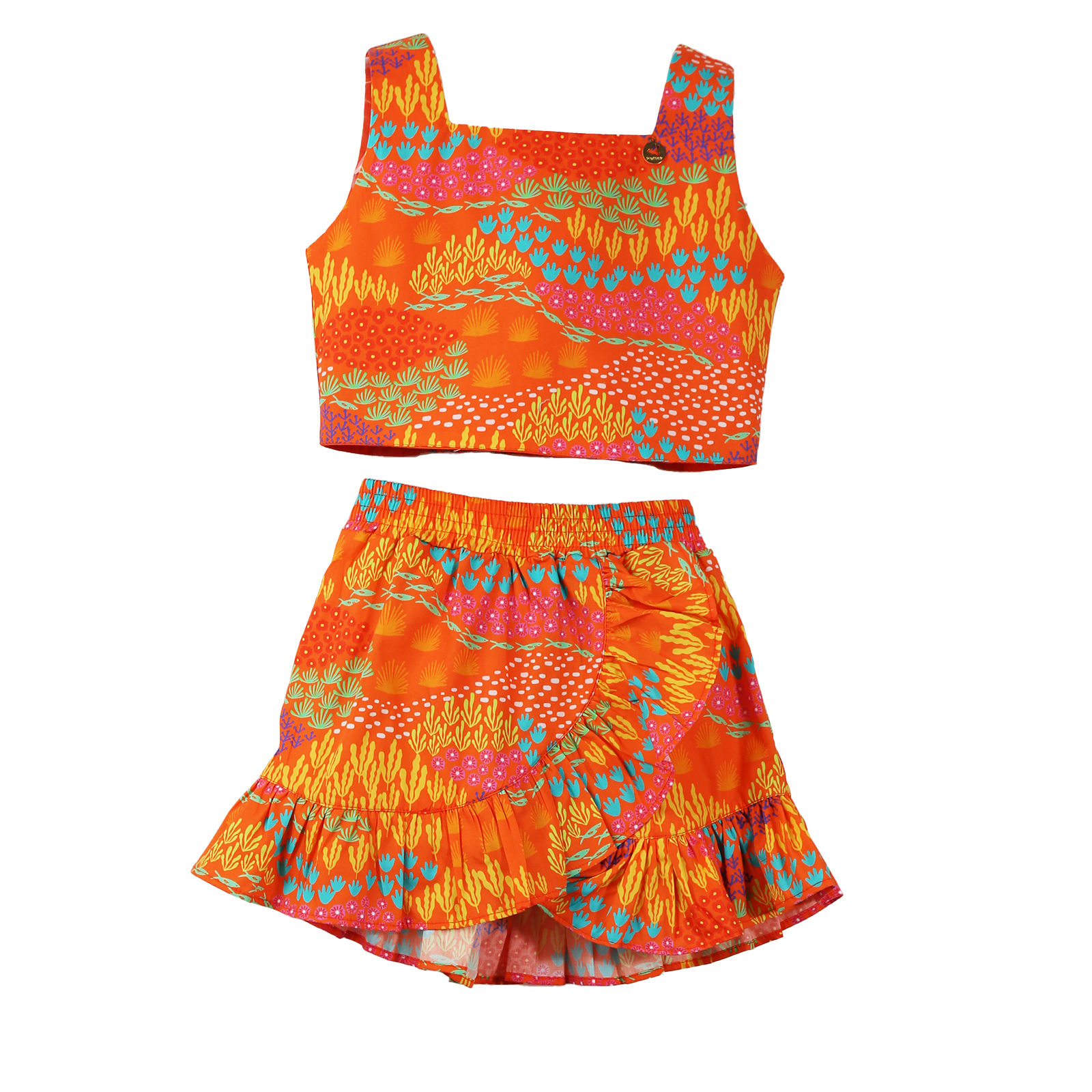 Conjunto infantil em tecido de algodão, blusa cropped decote quadrado, lastex nas costas. Saia com cós de elástico, recorte assimétrico com babado, shortinho de malha por debaixo. Feito com a nossa estampa exclusiva “CANTEIRO DO MAR FUNDO LARANJA”.