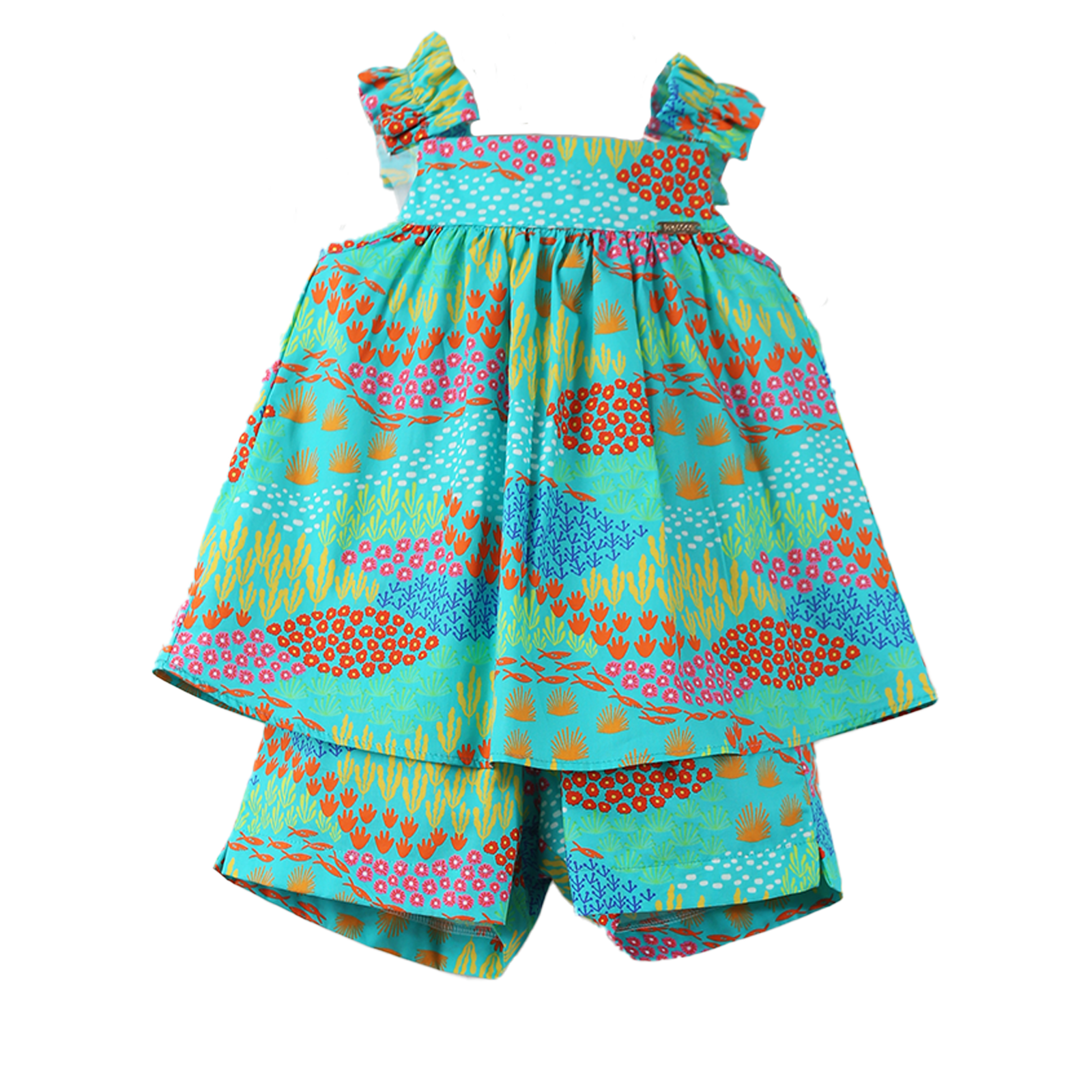 Conjunto infantil feminino em tecido de algodão, decote reto, alça com babadinho, pala pequena soltinho e confortável com abotoamento nas costas. Short com cós de elástico, recorte e abertura na barra. Feito com a nossa estampa exclusiva “CANTEIRO DO MAR”.