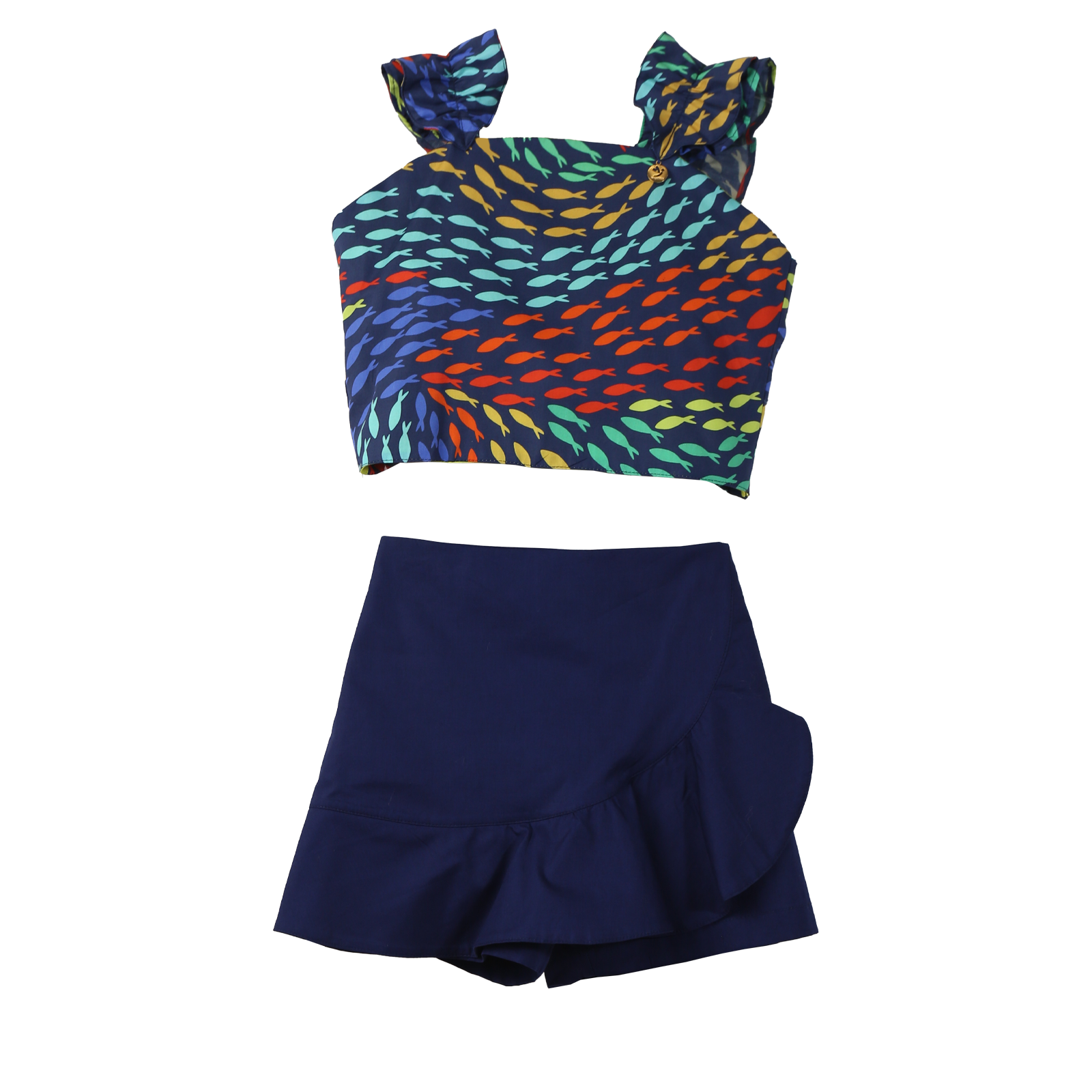 Conjunto infantil em tecido de algodão, blusa de alça com babado e amarração nas costas. Feito com a nossa estampa exclusiva “CARDUME FUNDO MARINHO”. Short-saia, elástico nas costas, recorte assimétrico na frente com babado.