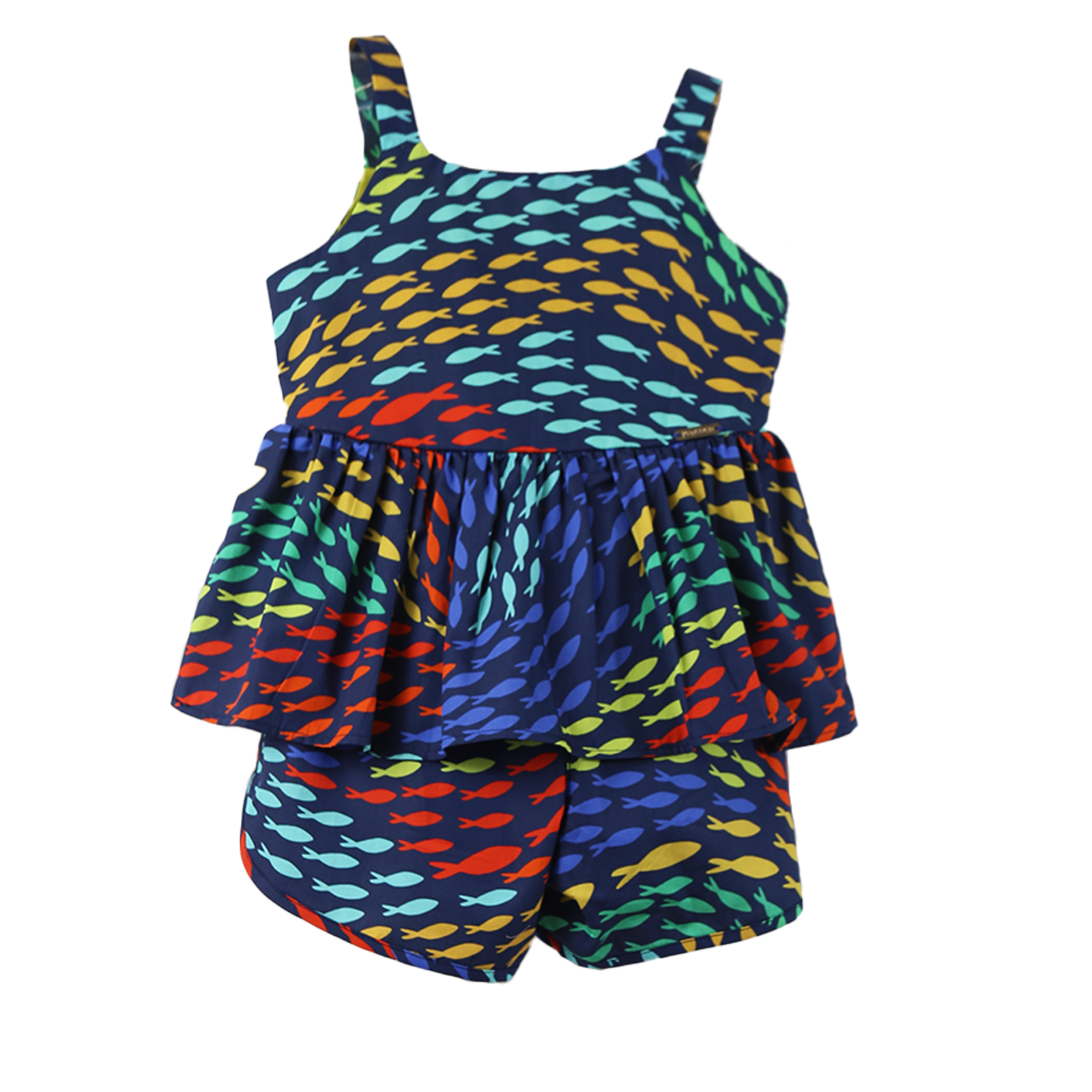 Conjunto infantil feminino em tecido de algodão, blusa com decote reto, alças, pala média abrindo a roda da blusa. Abotoamento nas costas. Short com cós de elástico, barra com acabamento de viés. Feito com a nossa estampa exclusiva “CARDUME”.