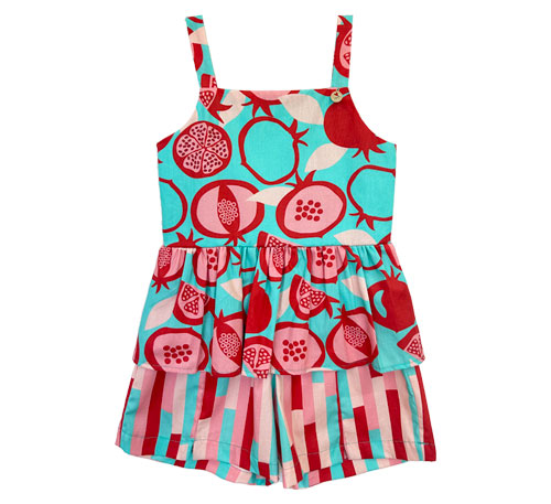 Conjunto infantil em tecido de algodão, blusa decote reto, alças largas, pala média franzindo e abrindo a roda da blusa, elástico nas costas. Short com cós de elástico, recorte na frente com pequena abertura na barra. Soltinho e confortável. Feito com a nossa estampa exclusiva “Geométrico” e “Colheita de romã”.