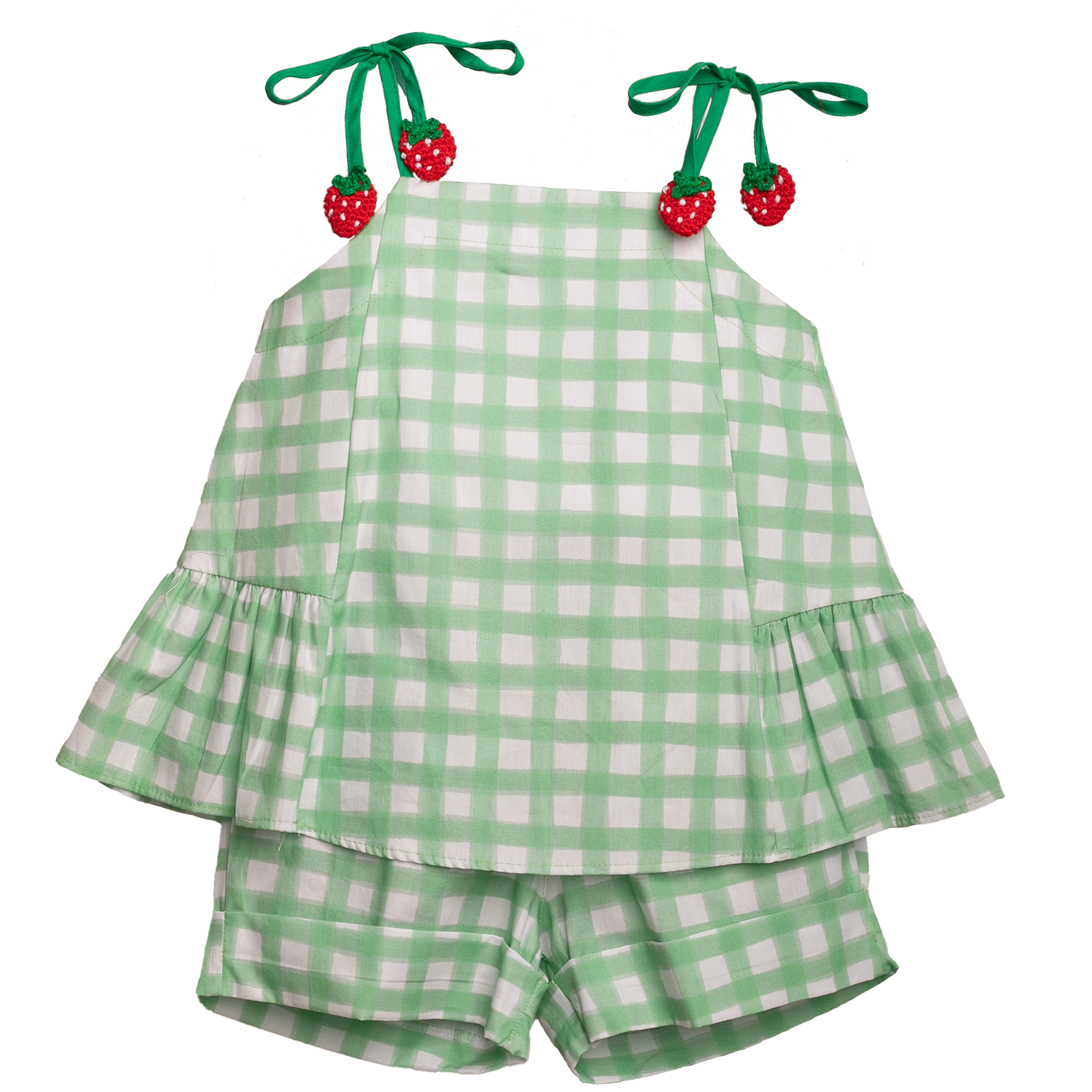 Conjunto infantil em tecido de algodão. Blusa decote reto, com alças de amarração em viés, ponteiras bordadas, detalhes de babados nas laterais. Shortinho com cós de elástico soltinho e confortável.