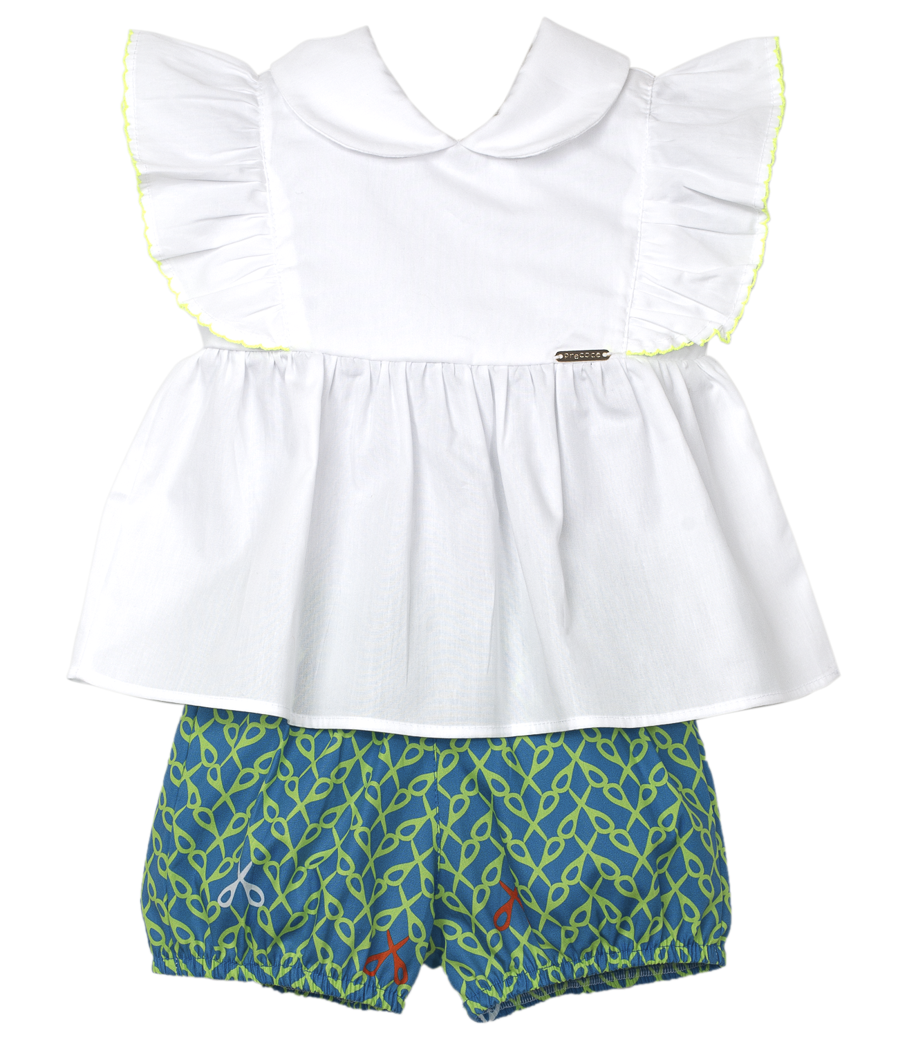 Shortinho fofo com elástico na cintura e pernas. Feito com a nossa estampa exclusiva “Dança das tesouras”.