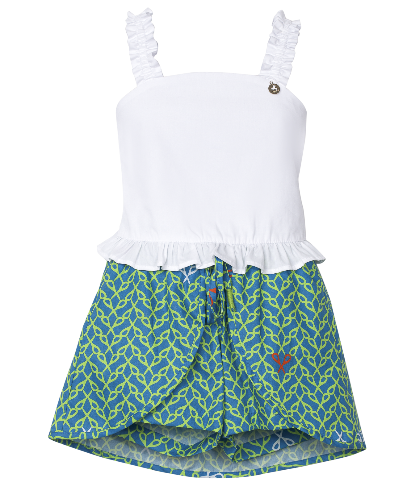 Conjunto infantil feminino em tecido de algodão, blusa com decote reto, alça com elástico, costas com lastex. Babadinho na barra. Short-saia com amarração. Feito com a nossa estampa exclusiva “DANÇA DAS TESOURAS FUNDO AZUL”