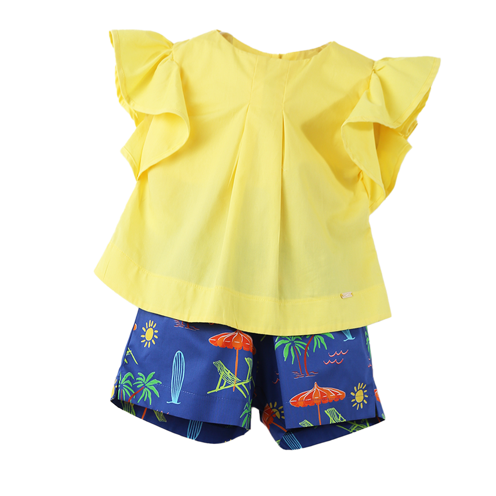 Conjunto infantil feminino em tecido de algodão, blusa com decote em U, manga de babado, pregas frontais, modelagem evasê. Short com cós de elástico, recorte com a abertura na barra, soltinho e confortável. Feito com a nossa estampa exclusiva “DESENHANDO AS FÉRIAS FUNDO AZUL”.
