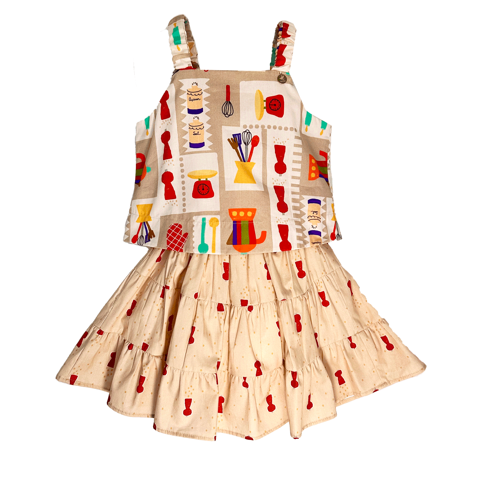 Conjunto infantil em tecido de algodão, blusa decote reto, alças com elástico, modelagem reta e abotoamento nas costas. Saia com cós de lastex, recorte franzido abrindo a roda, shortinho por debaixo para maior conforto. Feito com as nossas estampas exclusivas “Dia de mini chefe” e “Temperinhos do chefe”.