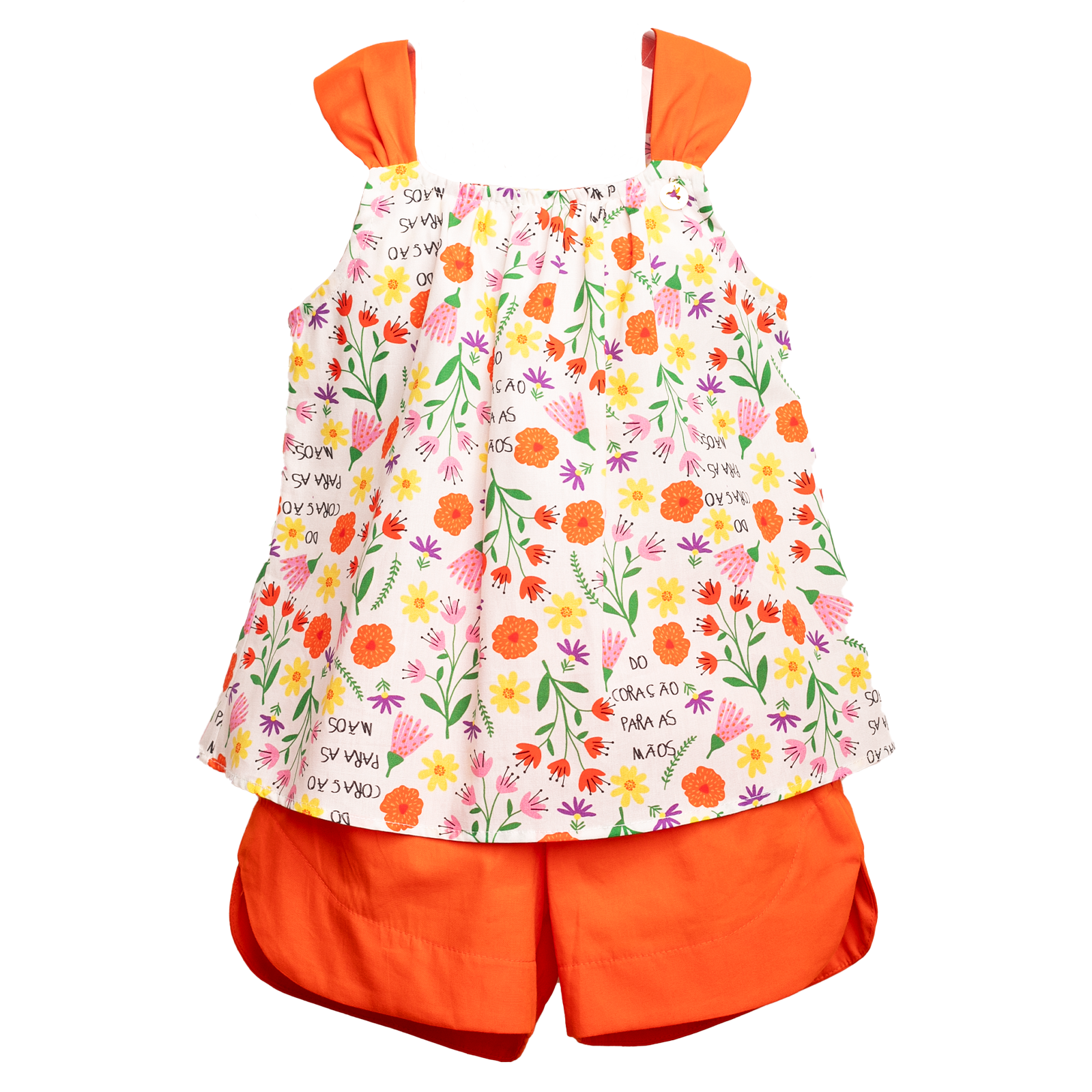 Conjunto infantil em tecido de algodão, blusa com decote U, alça franzida, pequena abertura nas costas e fechamento com botão, modelagem ampla e confortável. Short com cós de elástico, revel na barra. Soltinho e confortável. Feito com a nossa estampa exclusiva “DO CORAÇÃO PARA AS MAÕS“.