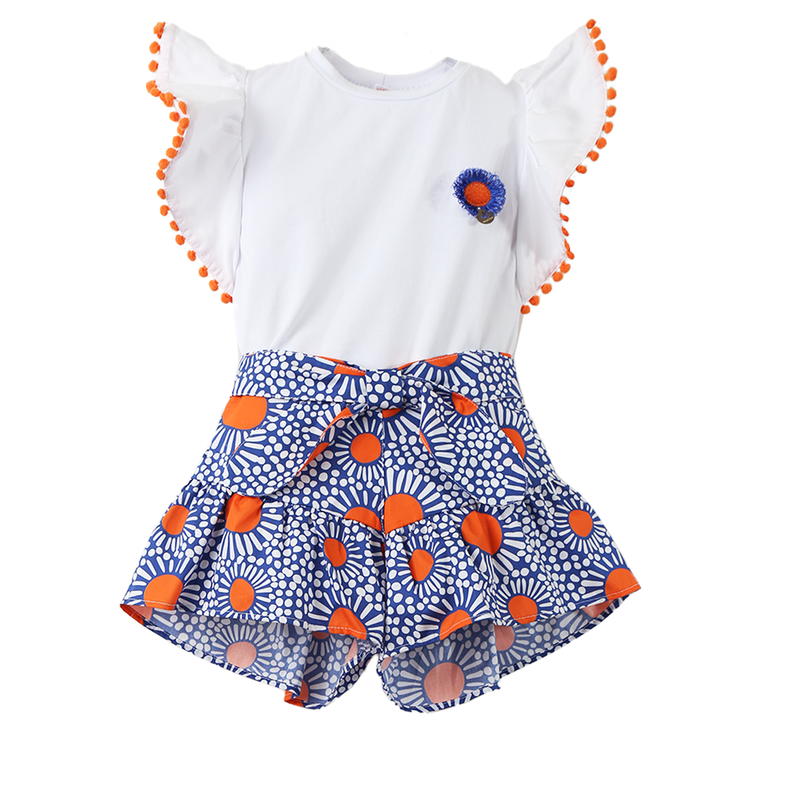 Conjunto infantil feminino em, blusa em malha de algodão com decote em U, manga de babado com detalhe de pompom, bordado frontal. Short com amarração na frente e elástico nas costas, soltinho e confortável. Feito com a nossa estampa exclusiva “FLOR DE OURIÇO FUNDO AZUL”.