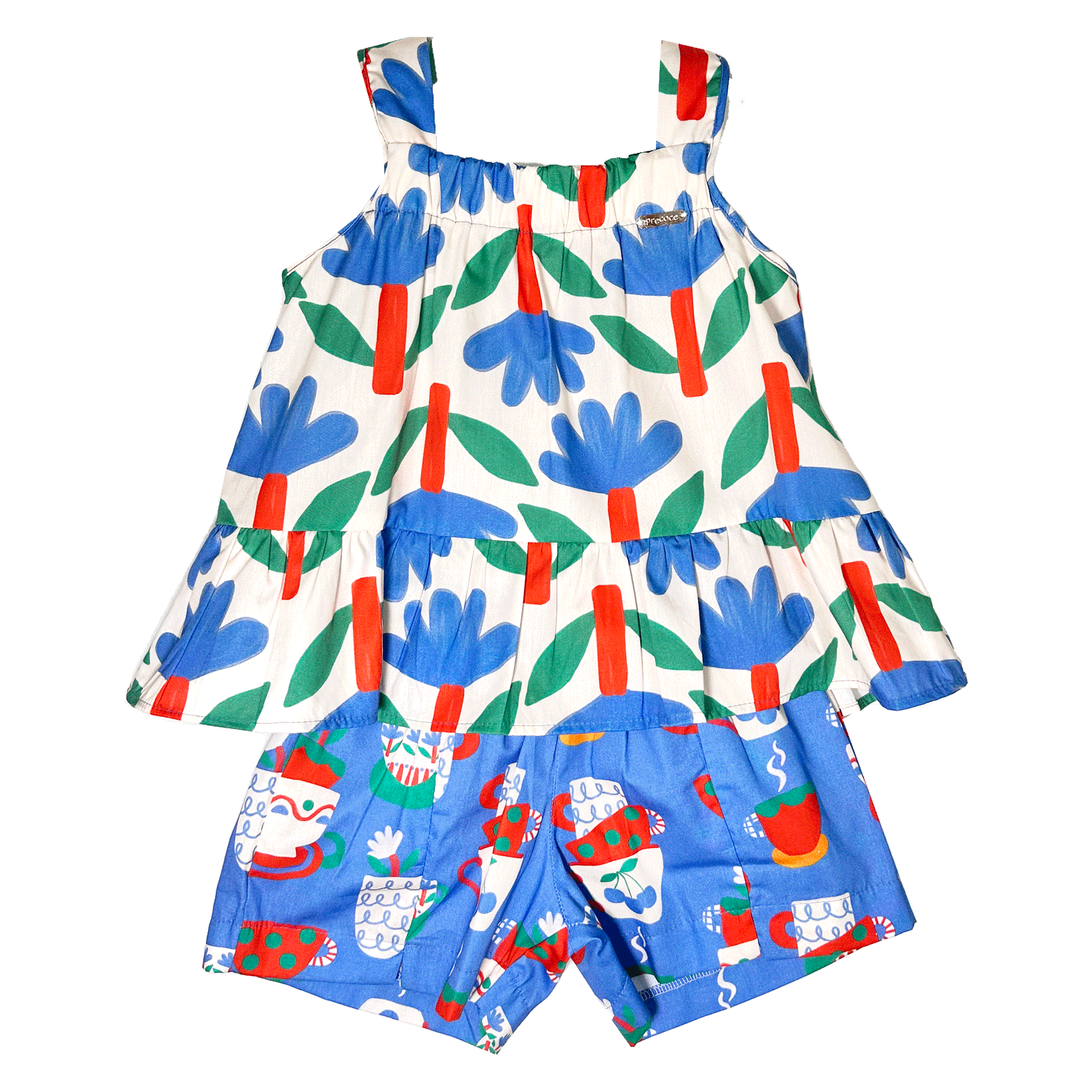 Conjunto infantil, blusa larguinha, decote com elástico, alças largas, babadinho na barra. Short confortável com elástico na cintura. Feito com a nossa estampa exclusiva “Flores pintadas” e “Xícara composê”.