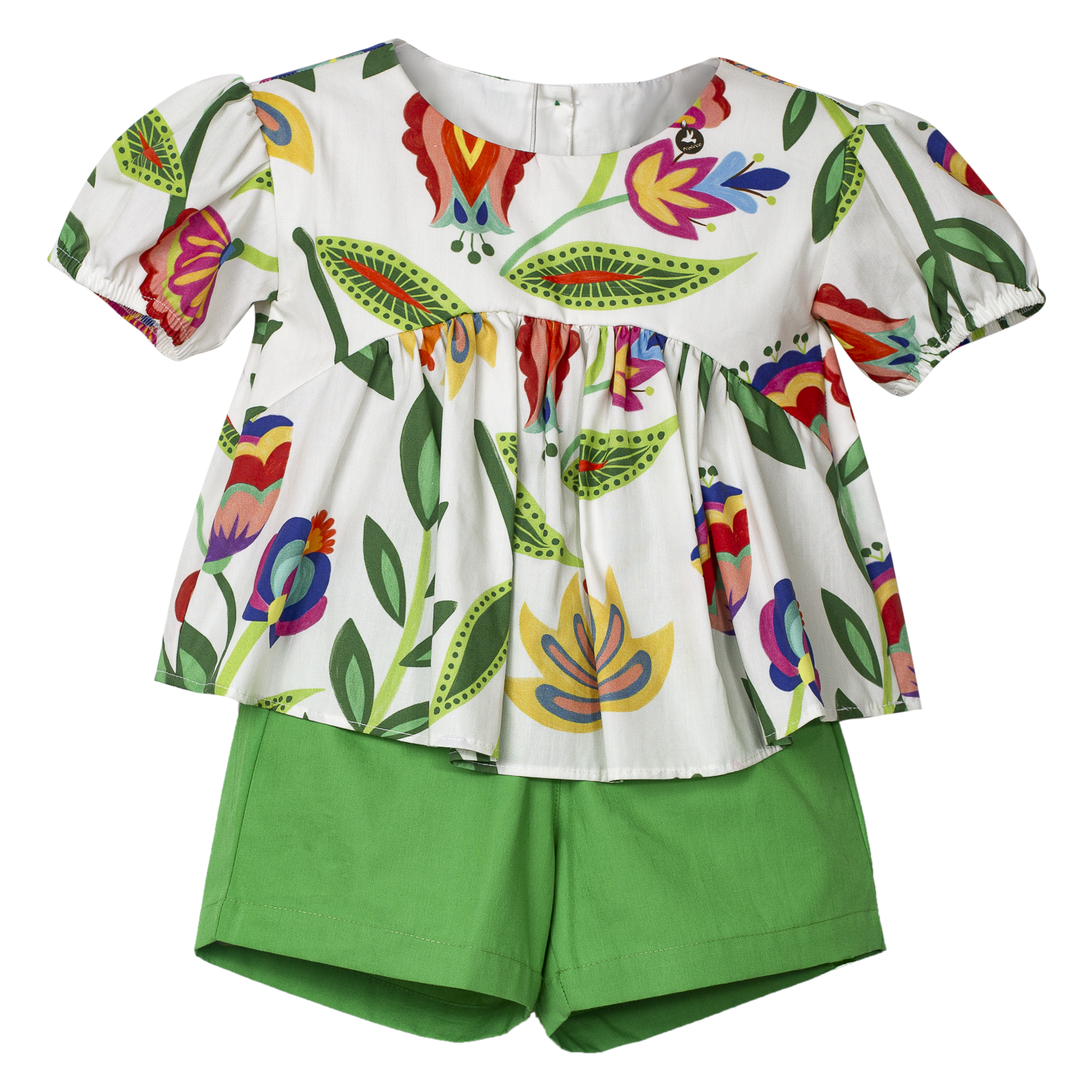 Conjunto infantil feminino em tecido de algodão, decote em U, mangas fofas com elástico, pala assimétrica,abototmento nas costas. Short soltinho e confortável. Feita com a nossa estampa exclusiva “FLORILÂNDIA FUNDO OFF”.