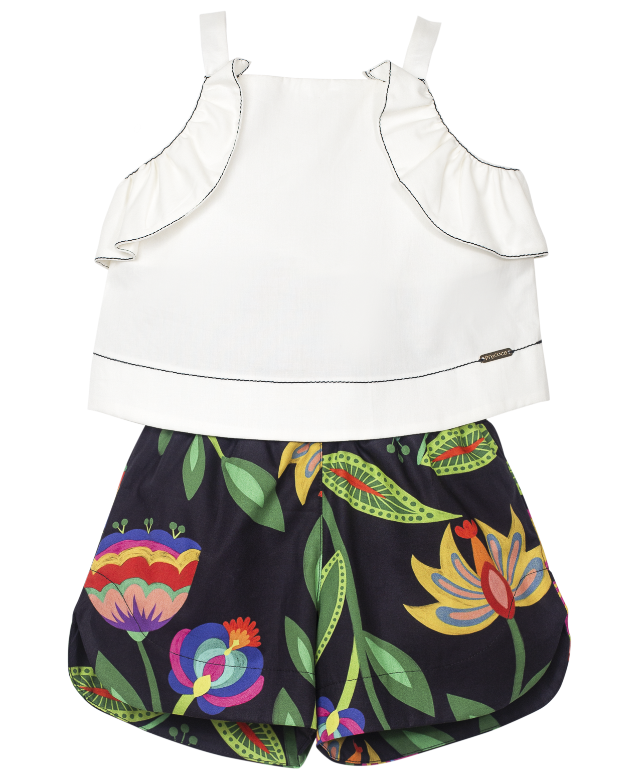 Conjunto infantil feminino em tecido de algodão, blusa com decote reto babado nas cavas. Abotoamento nas costas.