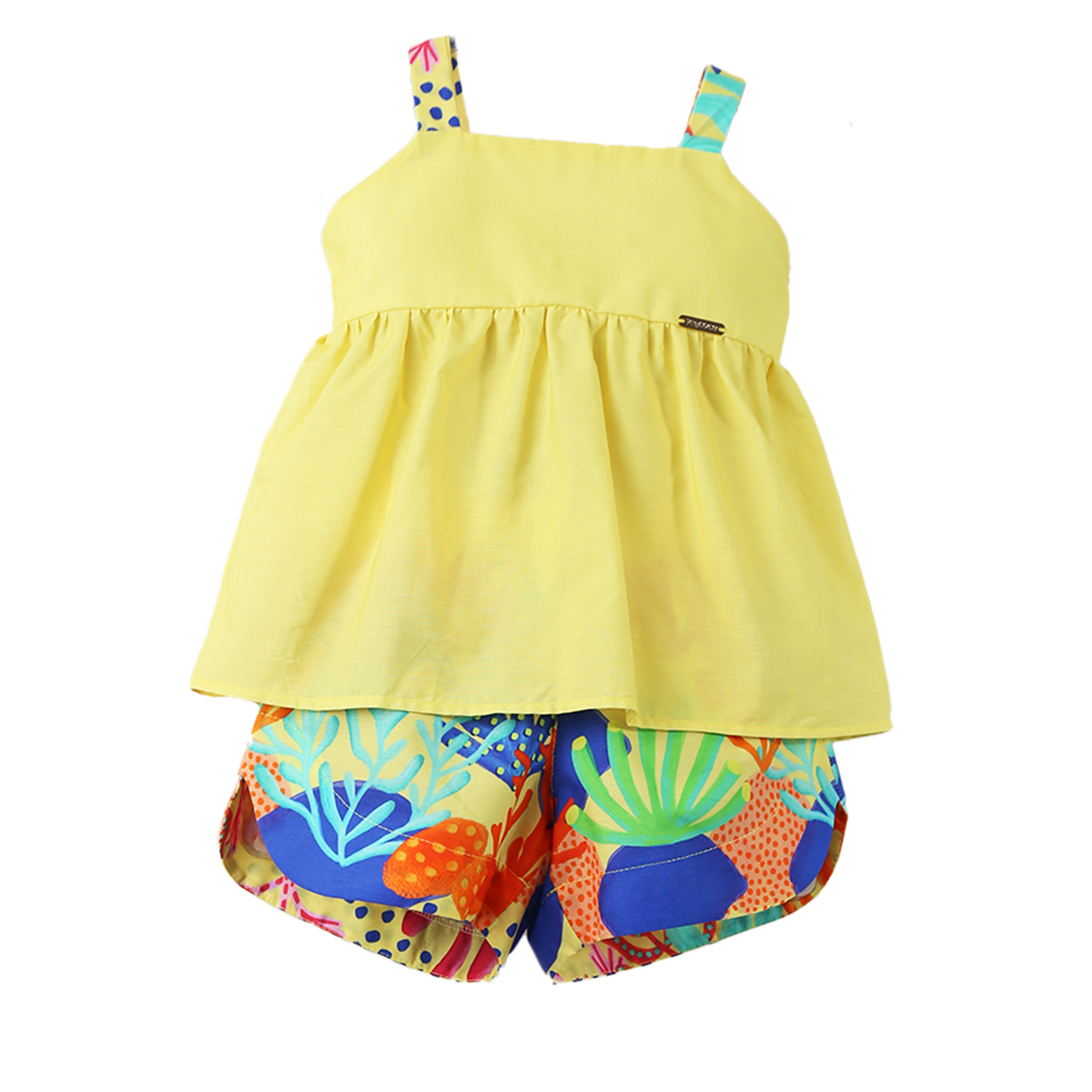 Conjunto infantil feminino em tecido de algodão, blusa com decote reto, alças, pala média abrindo a roda da blusa. Abotoamento nas costas. Short com cós de elástico, barra arredondada nas laterais. Feito com a nossa estampa exclusiva “BARRADO JARDIM DE ALGA FUNDO AMARELO”.