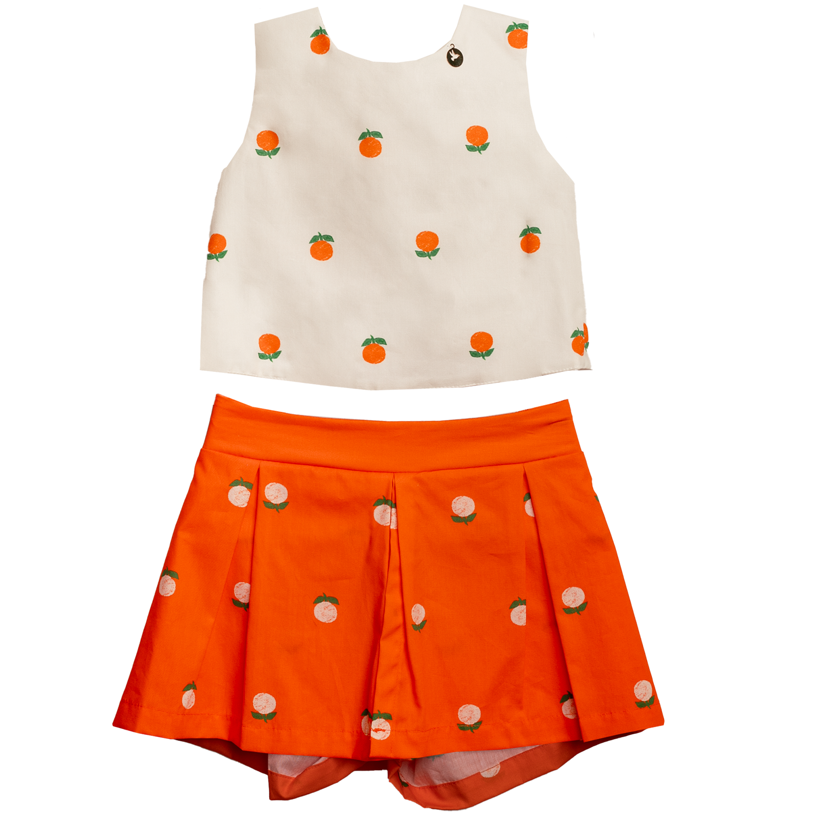 Conjunto infantil feminino em tecido de algodão, blusa decote redondo, costas com decote, abertura e laço. Short-saia em tecido com pregas e cós com elástico nas costas. Feito com a nossa estampa exclusiva “LARANJINHA”.