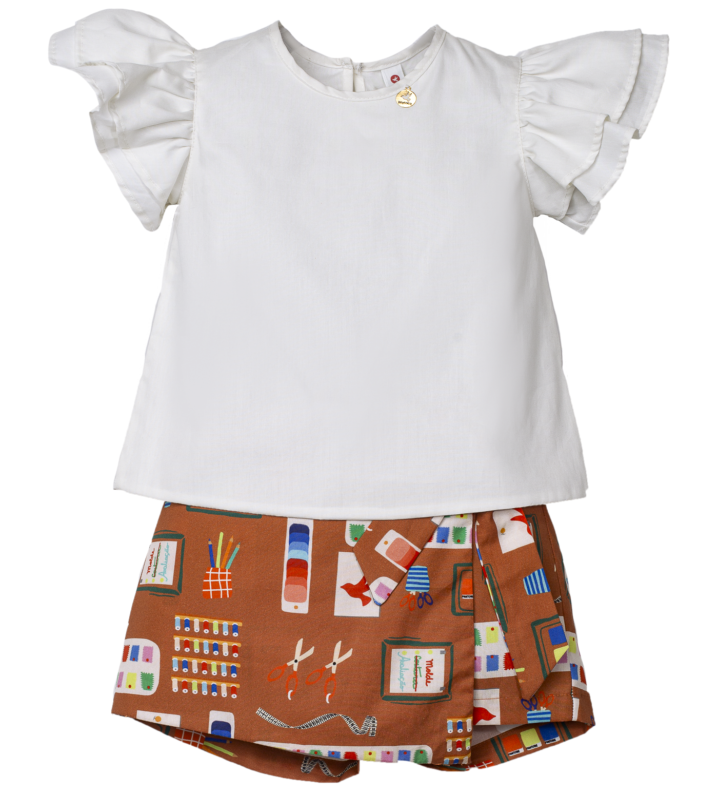 Conjunto infantil feminino em tecido de algodão, decote em U, manguinhas com babados. Abotoamento nas costas. Short- saia com amarração na frente e elástico nas costas. Feito com a nossa estampa exclusiva “PAINEL DE INSPIRAÇÃO FUNDO TERRACOTA”.