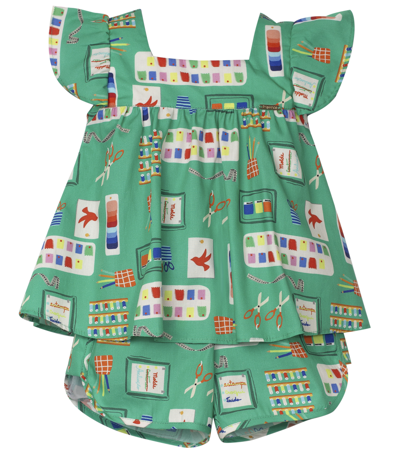 Conjunto infantil em tecido de algodão, blusa decote quadrado, pala pequena franzindo e abrindo a roda da blusa, manga, short com cós de elástico, detalhe na lateral e acabamento de viés na barra.