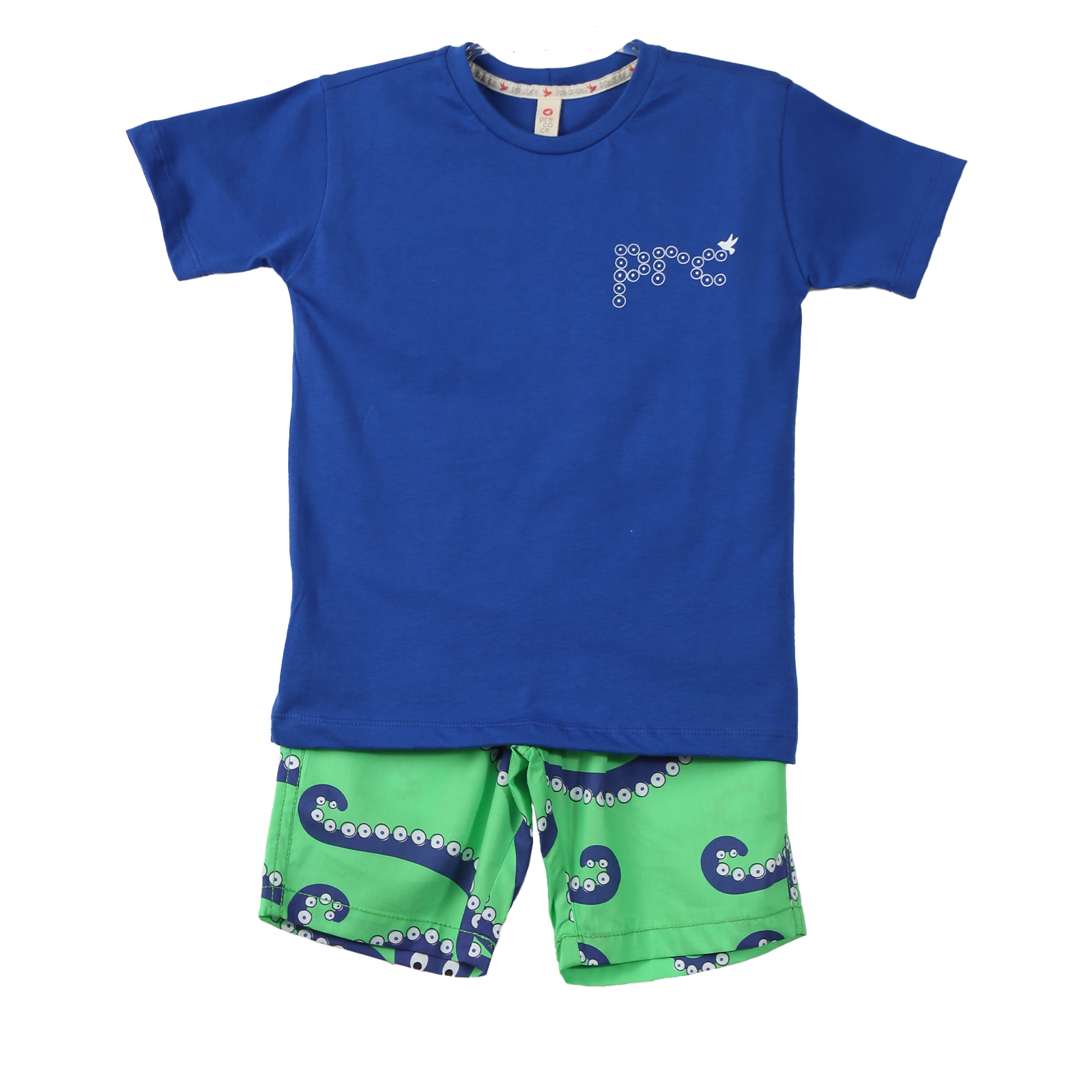 Conjunto infantil masculino, t-shirt em malha de algodão, decote careca, manga curta, estampa localizada. Bermuda em tecido de algodão, elástico na cintura, modelagem confortável, bolso faca, feita com nossa estampa exclusiva “POLVO GIGANTE”.