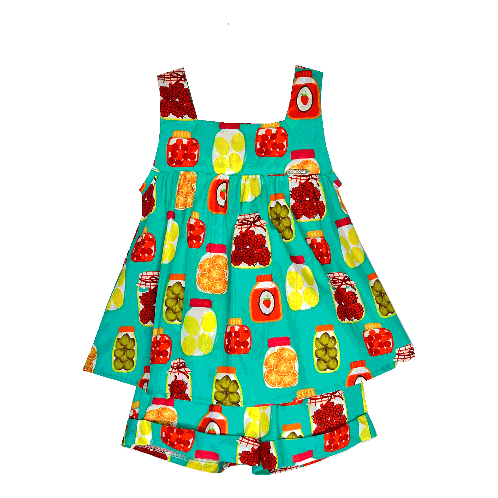 Conjunto infantil em tecido de algodão, decote reto, alças largas, palinha franzindo e abrindo a roda da blusa. Short com cós de elástico e barra italiana. Soltinho e confortável. Feita com a nossa estampa exclusiva “Potes de doces”.