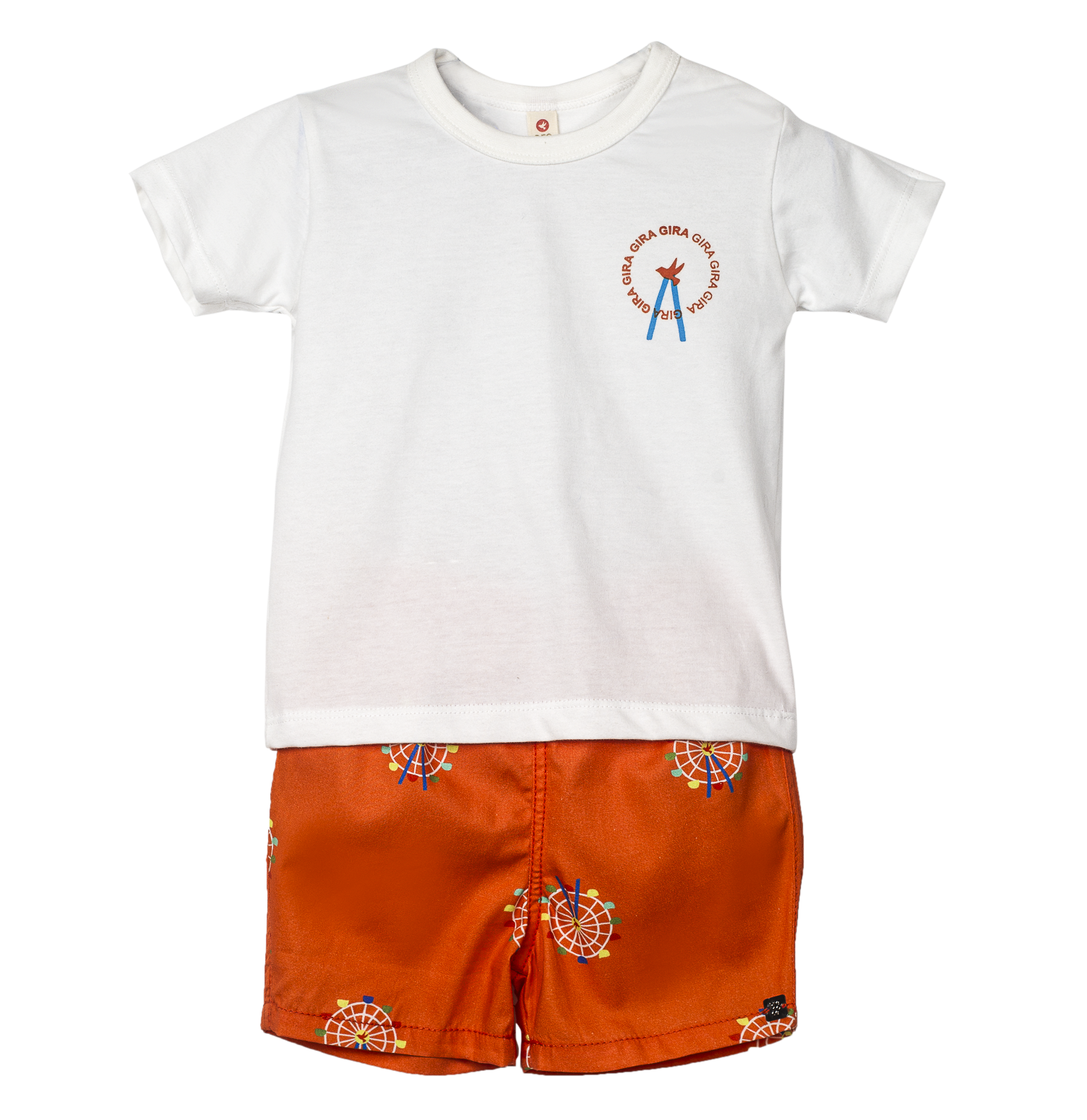 Bermuda em tecido de algodão e elástico na cintura, modelagem confortável. Feita com a nossa estampa exclusiva “RODA GIGANTE FUNDO LARANJA”.
