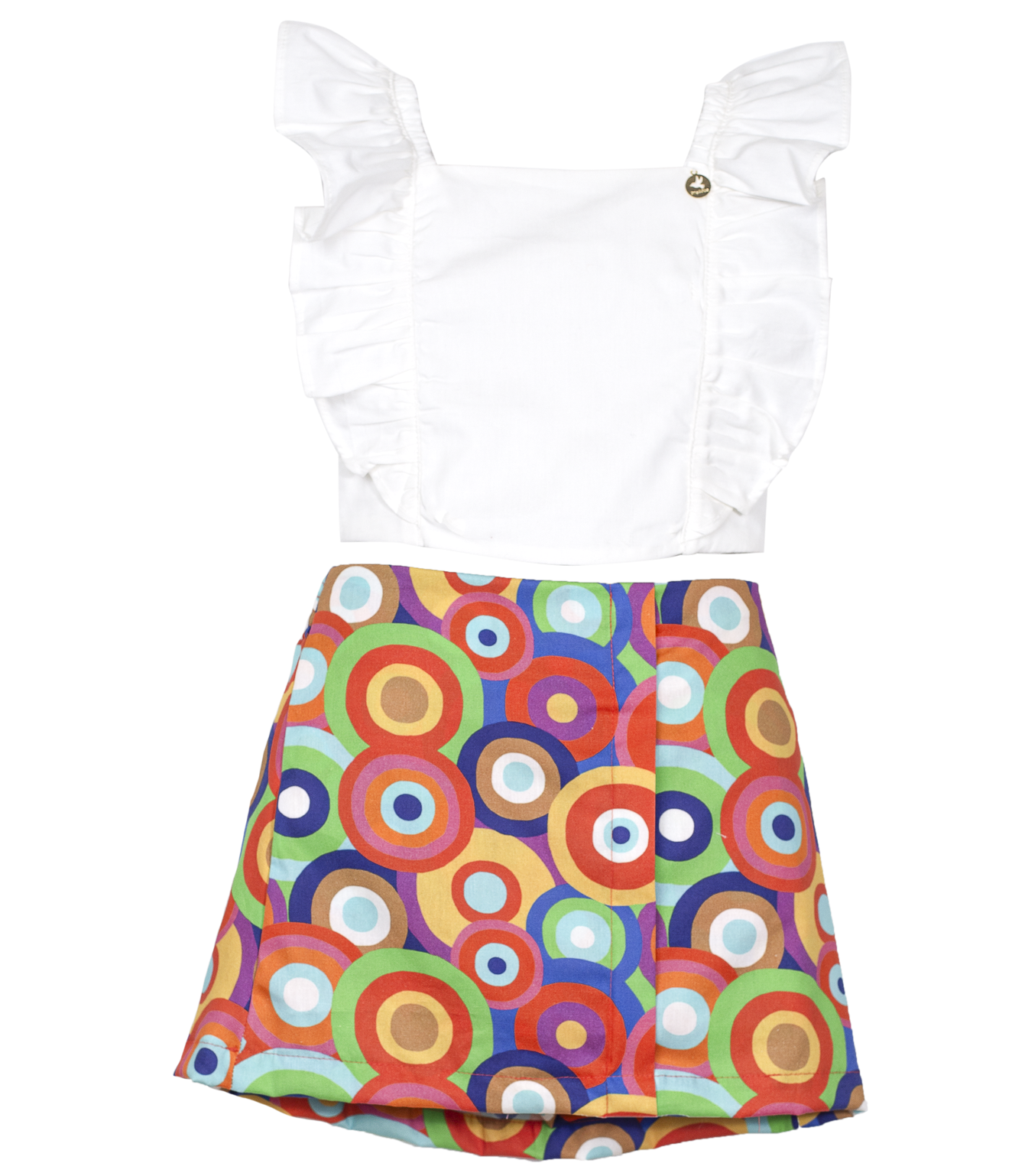 Conjunto infantil feminino em tecido de algodão, blusa decote reto, alça com elástico e babado embutido nas laterais. Lastex nas costas.