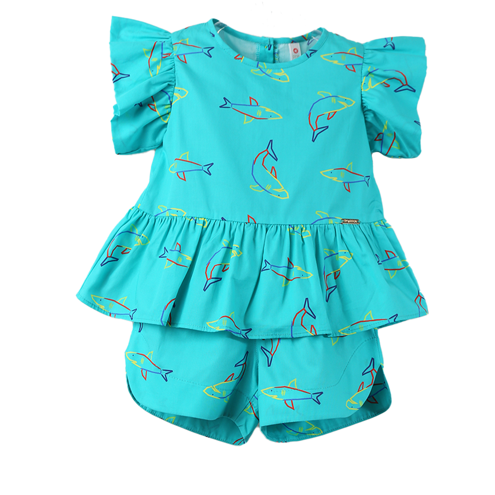 Conjunto infantil feminino em tecido de algodão, blusa decote em U mangas de babado, abotoamento nas costas e babado na barra. Short com cós de elástico, barra larga com leve curva na lateral. Feita com a nossa estampa exclusiva “TUBARÃO”.