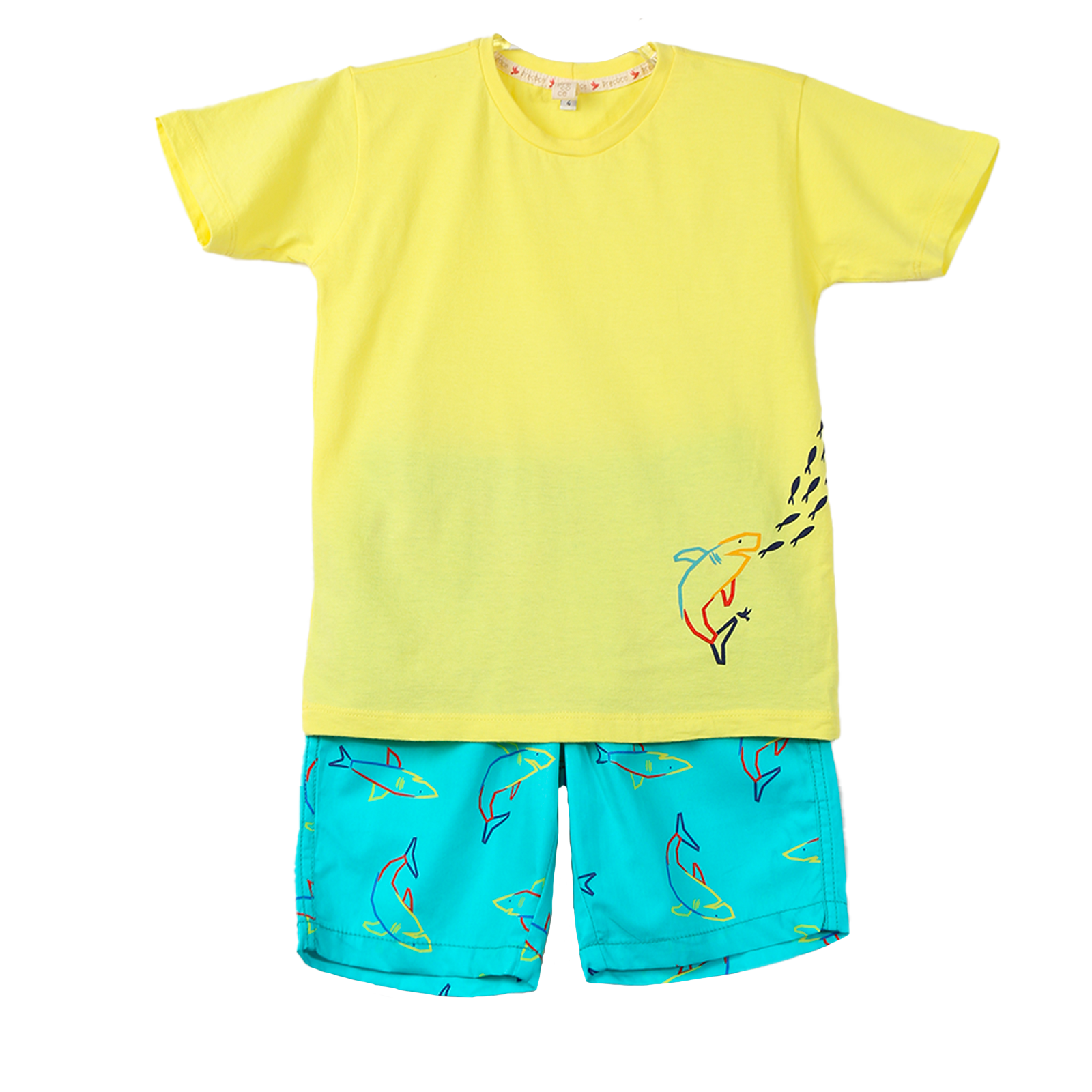 Conjunto infantil masculino, t-shirt em malha de algodão, decote careca, manga curta, estampa localizada. Bermuda em tecido de algodão, elástico na cintura, modelagem confortável, bolso faca, feita com nossa estampa exclusiva “TUBARÃO”.