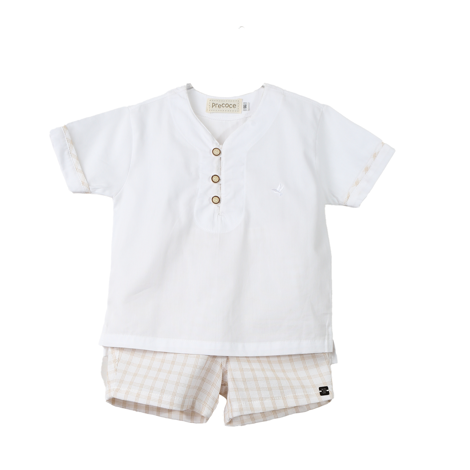 Conjunto bebê masculino em tecido de algodão, túnica manga curta, abertura com abotoamento frontal, bordado pássaro Precoce. Bermuda em tecido de algodão e elástico na cintura, modelagem confortável.