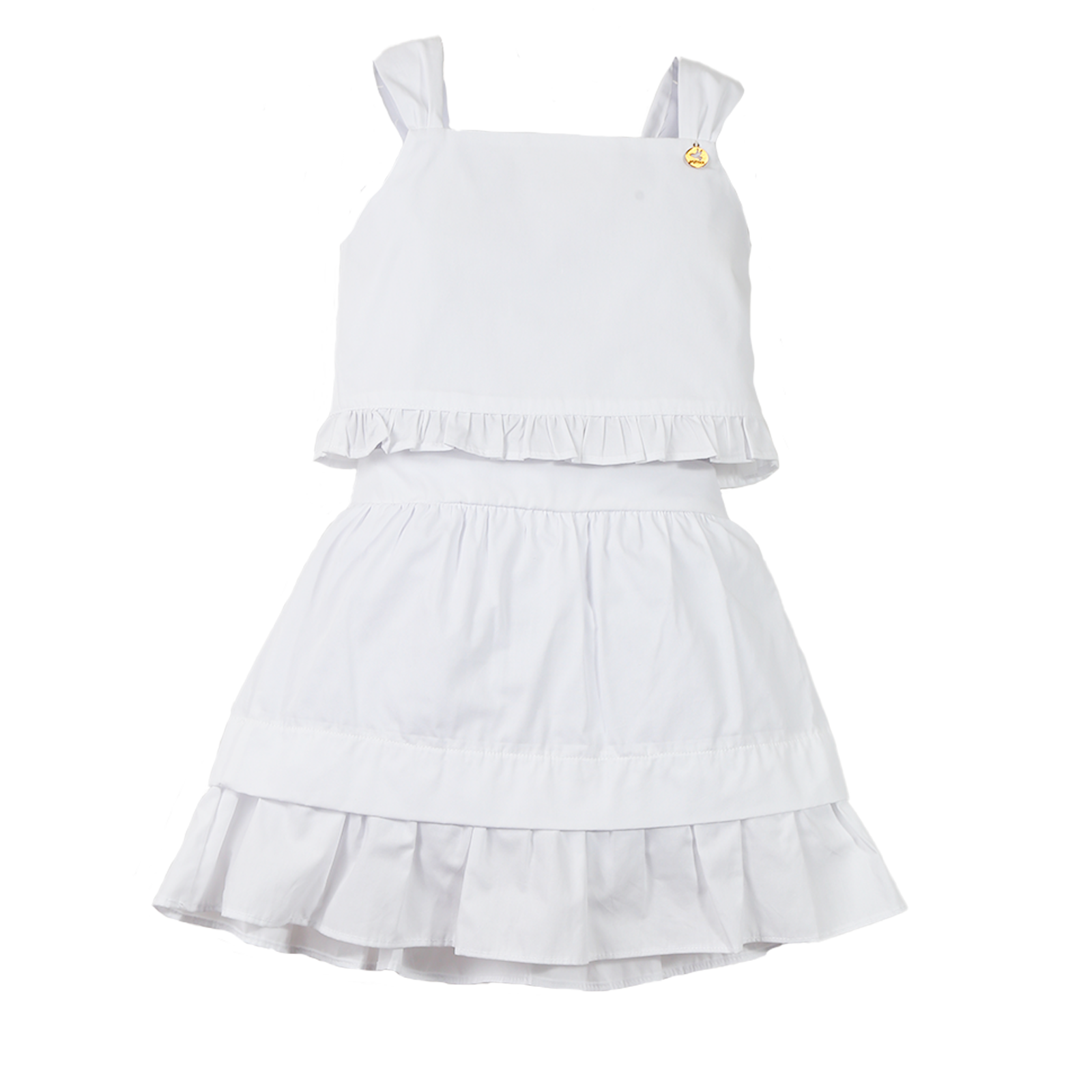 Conjunto infantil feminino em tecido de algodão, blusa com decote reto, alças, babadinho na barra, decote nas costas com amarração. Saia com cós de elástico rebatido, prega e babado na barra. Short de malha por baixo.