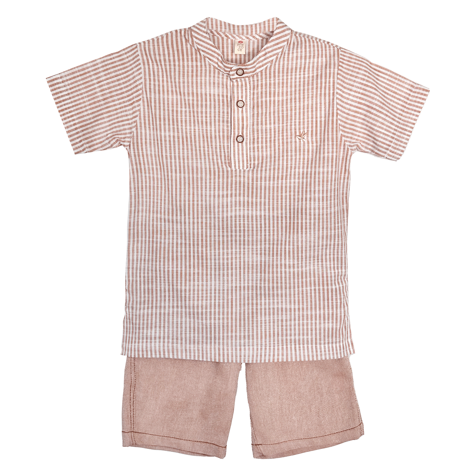 Conjunto infantil masculino, camisa em tecido de algodão com textura de linho, gola padre, bordado pássaro Precoce, manga curta, pequena abertura com botões. Bermuda em tecido de algodão, bolso faca, cós elástico na cintura, modelagem confortável.