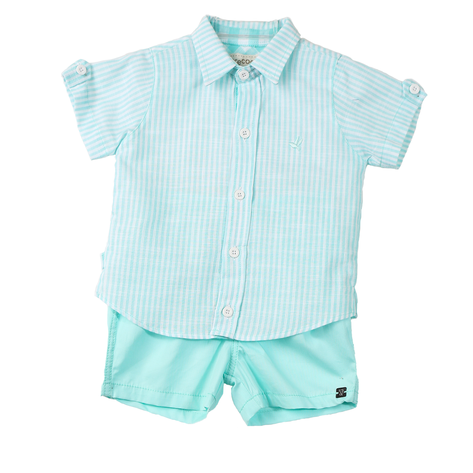 Conjunto bebê masculino, camisa manga curta em tecido de algodão com textura enrugada, gola tradicional, abotoamento frontal, detalhe com botão nas mangas. Bermuda em tecido de algodão e elástico na cintura, modelagem confortável. A equipe de estilo e design da Precoce tem o cuidado de desenvolver modelos que permitam a criança ser livre para ser criança.