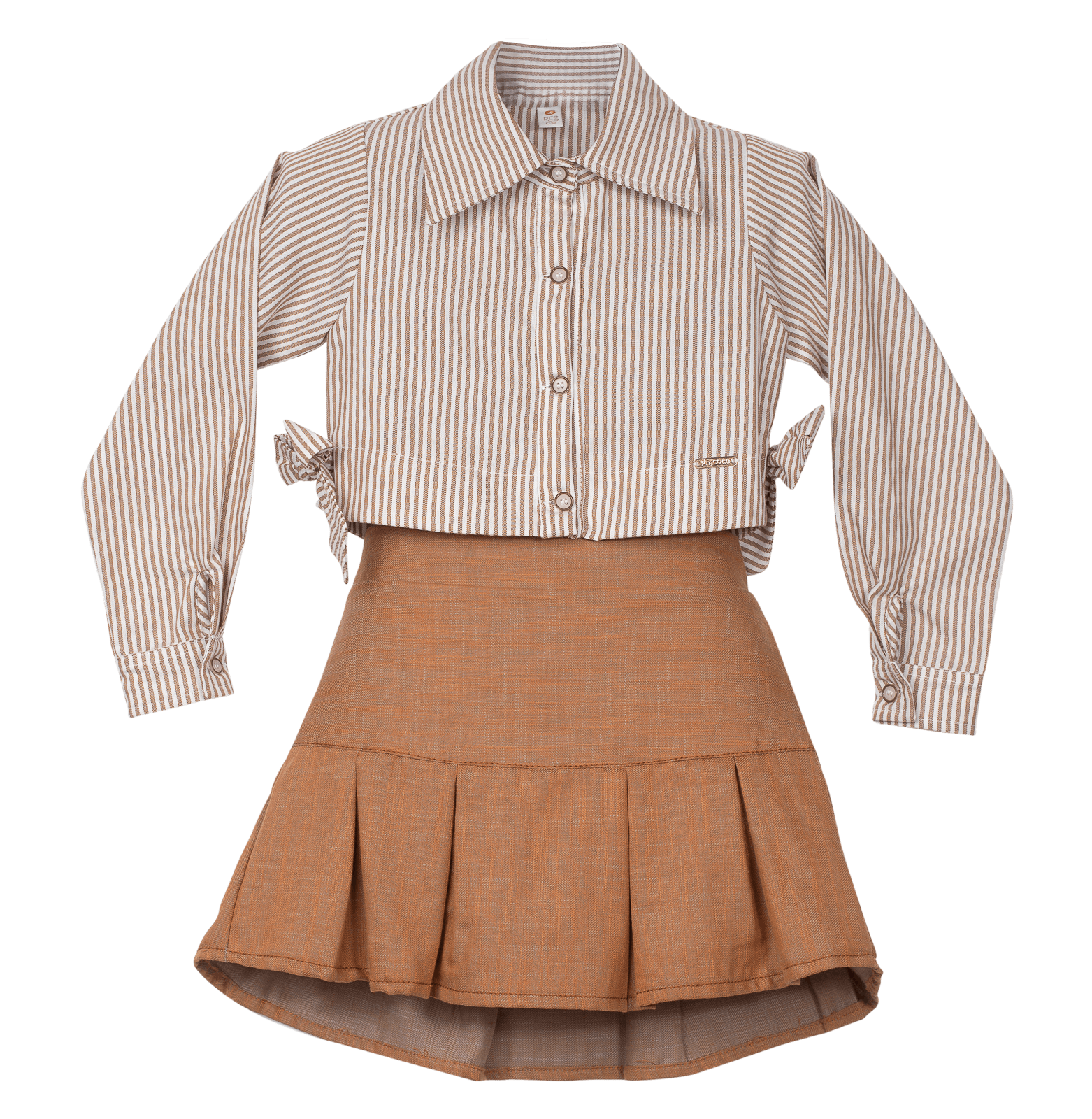 Conjunto infantil feminino em tecido de algodão, camisa cropped com gola tradicional, manga longa, abotoamento na frente, laços nas laterais. Saia com pregas e short em malha de algodão.
