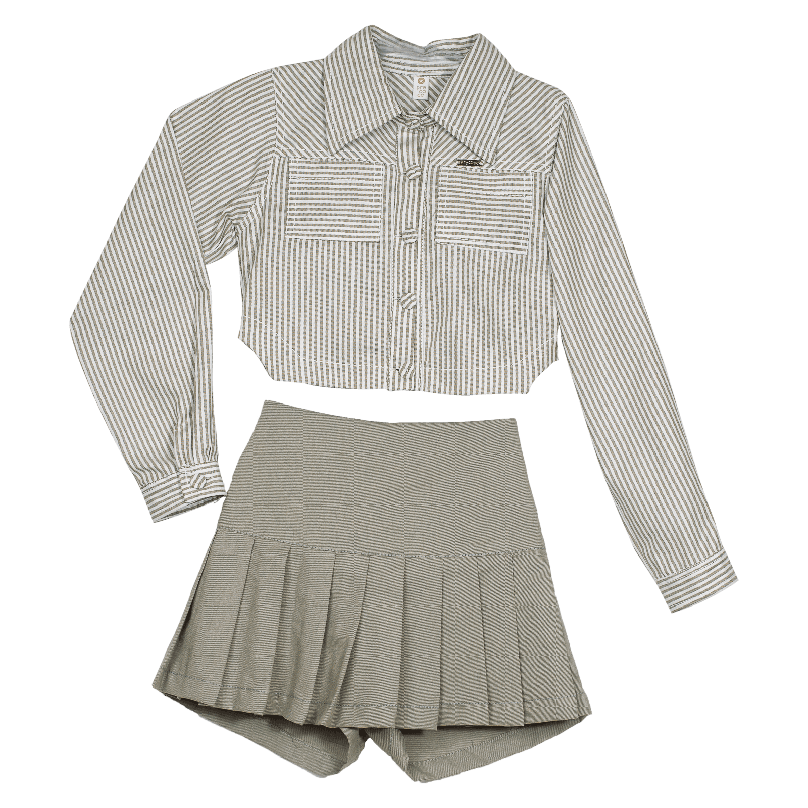 Conjunto infantil feminino em tecido de algodão, blusa cropped com gola tradicional, manga, abotoamento e bolso frontal. Short -saia com babado de pregas e com elástico nas costas.