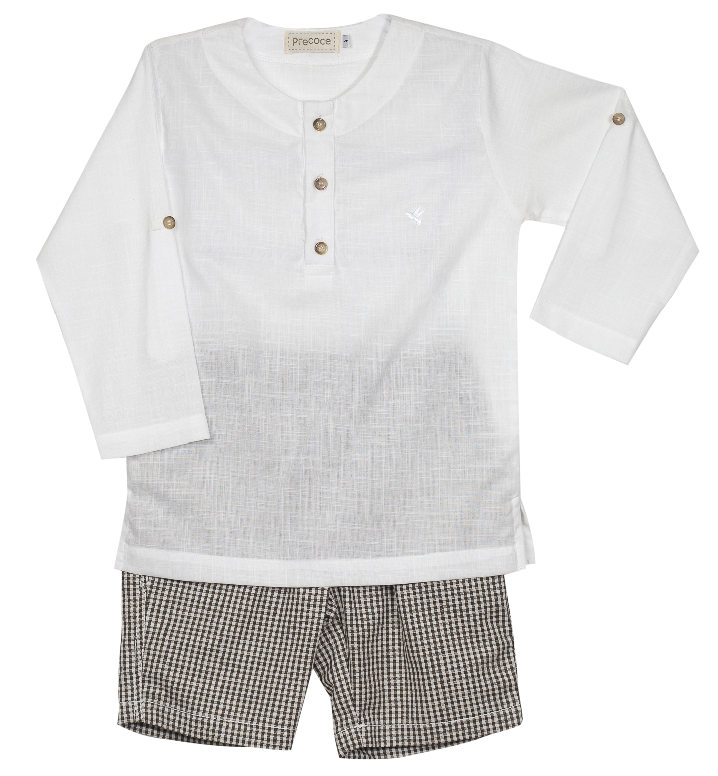 Conjunto infantil masculino em tecido de algodão, bata com abertura e abotoamento na frente, manga longa com botão para regular.