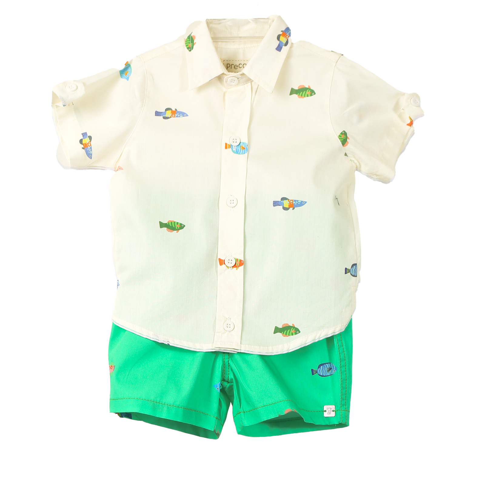 Conjunto bebê masculino, camisa manga curta em tecido de algodão, gola tradicional, abotoamento frontal, detalhe com botão nas mangas. Feito com a nossa estampa exclusiva “PEIXINHOS FELIZES”. Bermuda em tecido de algodão e elástico na cintura, modelagem confortável.