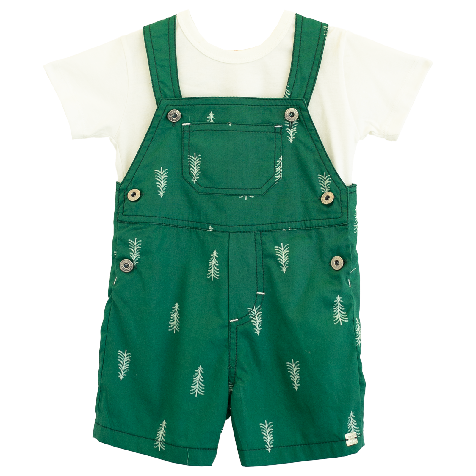 Conjunto bebê masculino, blusa manga curta em malha de algodão, gola careca, bordado pássaro Precoce. Abotoamento na lateral do ombro para facilitar na hora de vestir nossos bebês. Jardineira em tecido de algodão, bolsos e abotoamento na frente modelagem confortável. Feito com a nossa estampa exclusiva “Pinheirinho Fundo Verde Escuro”.