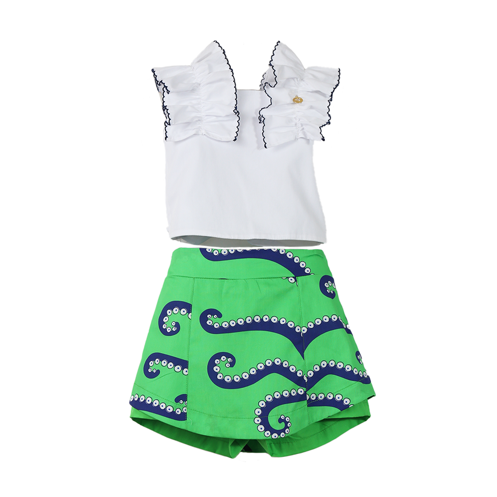 Conjunto infantil em tecido de algodão, blusa decote reto, alças largas com bordado ponto picueta, decote e amarração nas costas. Short- saia confortável com elástico na cintura. Feito com a nossa estampa exclusiva “POLVO GIGANTE”.