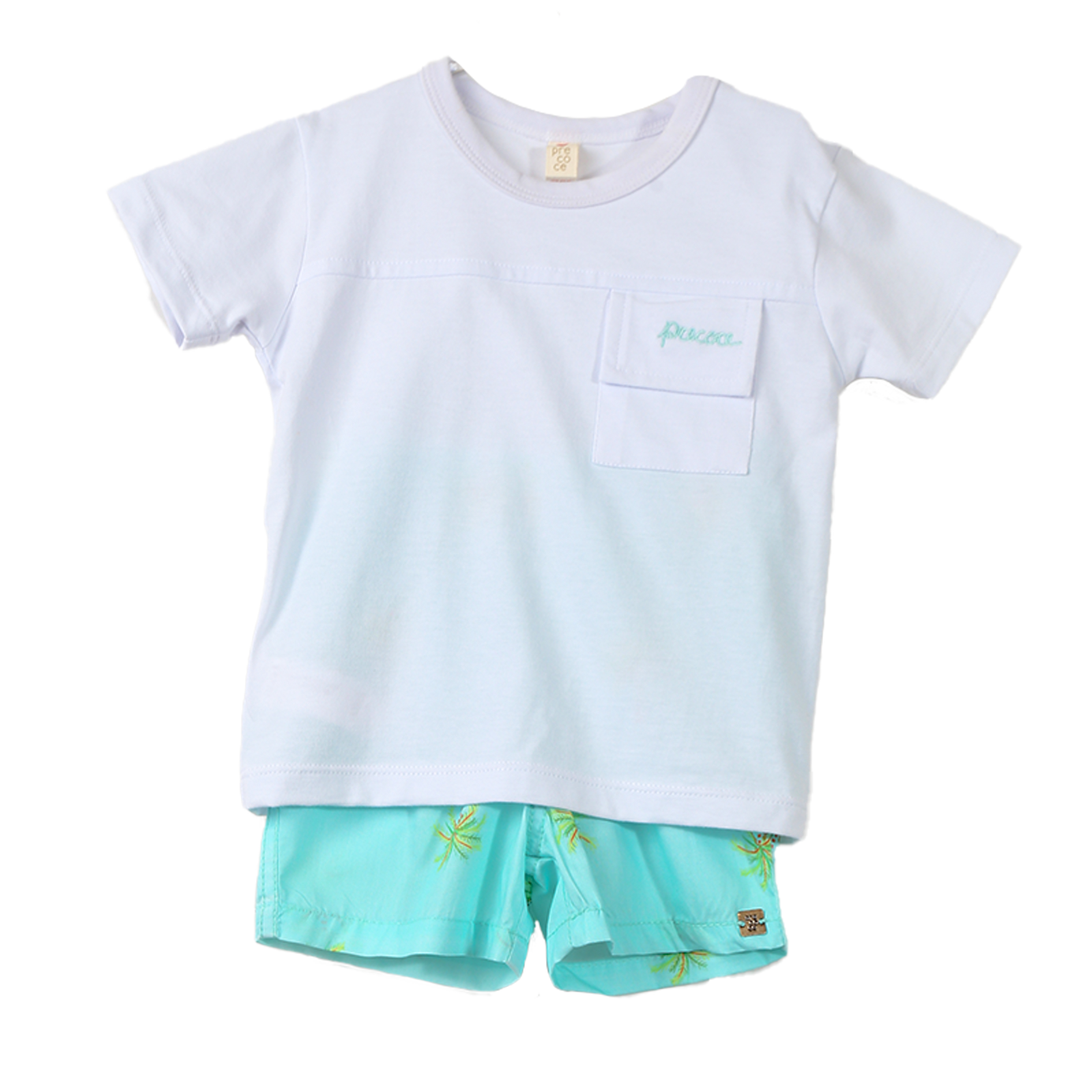 Conjunto bebê masculino, blusa manga curta em malha de algodão, gola careca, bolsinho com tampo e bordado. Abotoamento na lateral do ombro para facilitar na hora de vestir nossos bebês. Bermuda em tecido de algodão e elástico na cintura, modelagem confortável. Feita com a nossa estampa exclusiva “SUNSET FUNDO VERDE ÁGUA”.