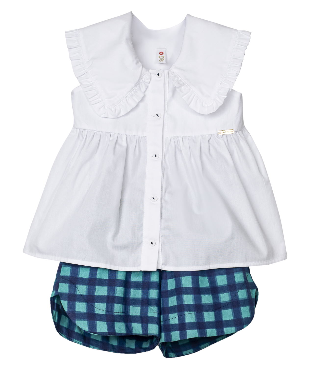 Conjunto infantil em tecido de algodão, blusa com gola marinheiro com babadinho, abotoamento frontal.